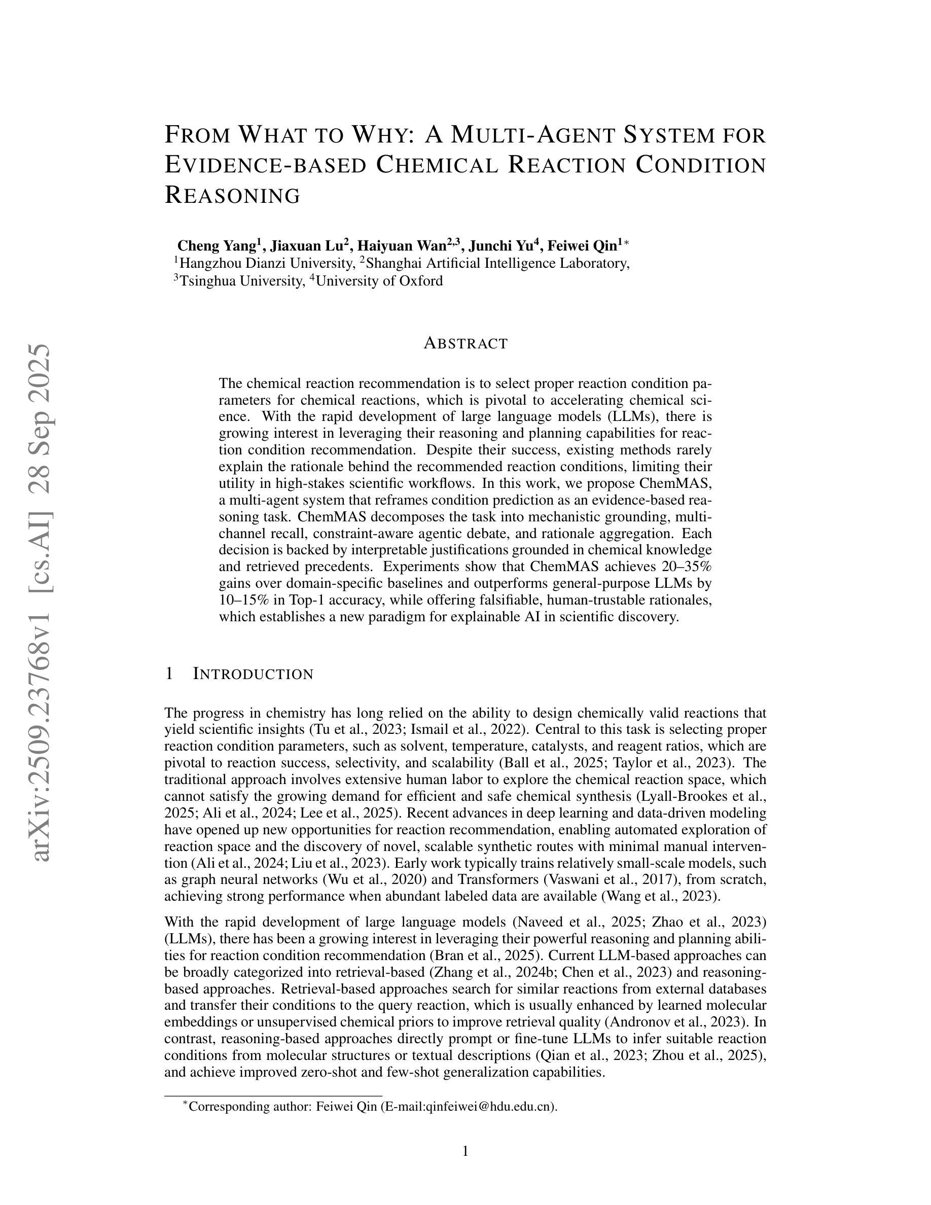 化学反应建议的关键在于为化学反应选择合适的反应条件参数,这对于加速化学科学至关重要。随着大型语言模型(LLM)的快速发展,人们越来越有兴趣利用它们的推理和规划能力来进行反应条件推荐。尽管取得了一定的成功,但现有方法很少解释推荐反应条件的依据,限制了它们在高风险科学工作流程中的实用性。在这项工作中,我们提出了ChemMAS,这是一个多代理系统,它将条件预测重新构建为基于证据推理的任务。ChemMAS将任务分解为机制基础、多渠道回忆、约束感知代理辩论和理由聚合。每个决策都有可解释的依据,依据的是化学知识和检索到的先例。实验表明,ChemMAS相较于特定领域的基线实现了20-35%的增益,在Top-1准确率方面比通用LLM高出10-15%,同时提供可验证的、值得信赖的理由,这为科学发现中的可解释人工智能建立了新的范式。