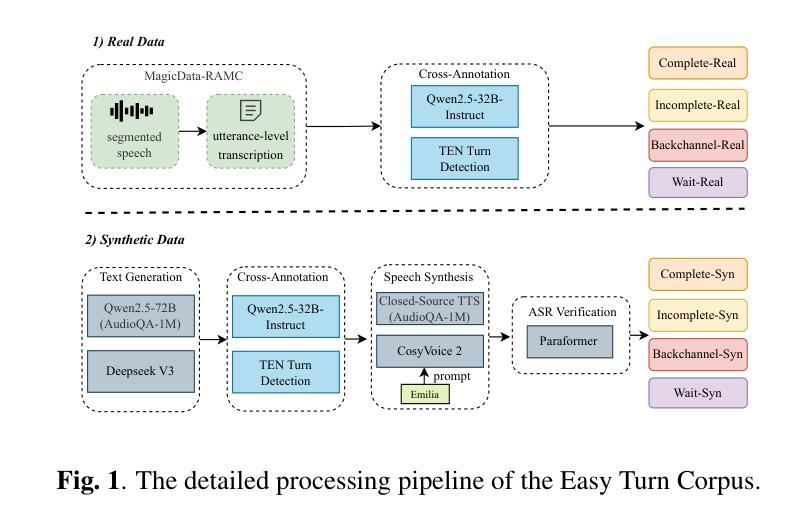 全双工交互对于自然的人机通信至关重要,但它仍然是一个挑战,因为它需要鲁棒的轮替检测来决定系统何时应该说话、倾听或保持沉默。现有解决方案要么依赖于专门的轮替模型,其中大多数都不是开源的。现有的少数几个受到其庞大参数大小的限制,或者仅支持单一模态,如声音或语言。另外,一些方法通过对大型语言模型(LLM)进行微调以启用全双工功能,但这需要大量的全双工数据,而在开源形式中这些数据仍然很稀缺。为了解决这些问题,我们提出了Easy Turn,这是一个开源的模块化轮替检测模型,它结合了声音和语言双模态信息来预测四种对话轮替状态:完成、未完成、后台通道和等待,并伴随着Easy Turn训练集的发布,这是一个专为训练轮替检测模型而设计的1145小时语音数据集。与现有的开源模型如TEN Turn Detection和Smart Turn V2相比,我们的模型在开源Easy Turn测试集上实现了最先进的轮替检测精度。数据和模型将在GitHub上公开提供。