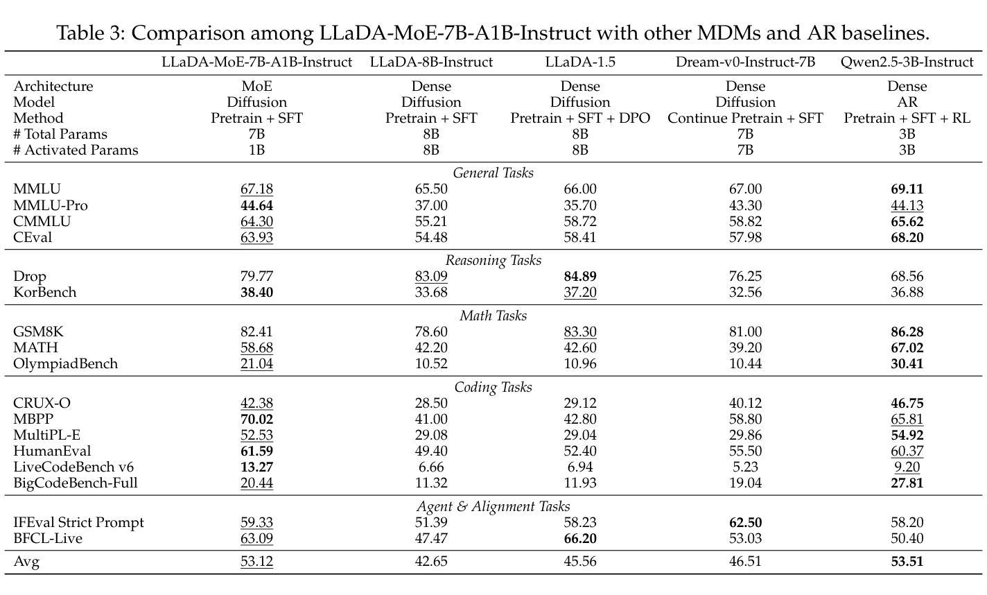 LLaDA-MoE是一个基于大型语言扩散模型与专家混合(MoE)架构的模型,使用约20T的令牌从头开始训练。LLaDA-MoE在维持7B参数容量的同时,推理时仅激活1.4B参数,实现了显著的计算效率。实证评估显示,LLaDA-MoE在多个基准测试中达到了扩散语言模型的最先进水平,超过了之前的LLaDA、LLaDA 1.5和Dream等模型。此外,LLaDA-MoE-7B-A1B-Instruct模型在知识理解、代码生成、数学推理、代理和对齐任务上的能力与Qwen2.5-3B-Instruct相当。整合稀疏MoE架构到掩码扩散语言模型的训练目标中,仍能在高效的推理和少量活跃参数下发挥MoE的优势,为扩散语言模型的进一步探索提供了广阔的空间。