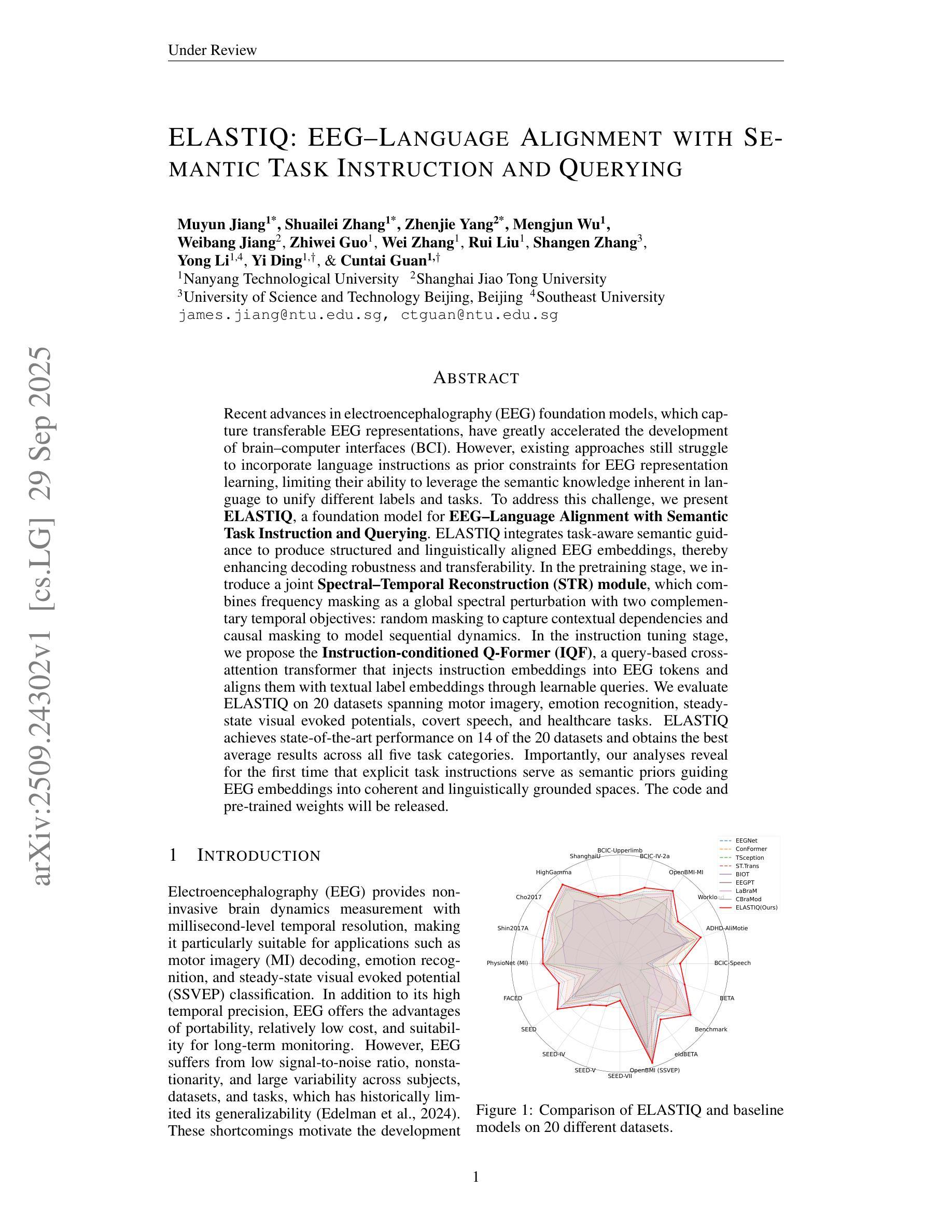 最近脑电图(EEG)基础模型的进步,这些模型能够捕捉可迁移的EEG表示,极大地加速了脑机接口(BCI)的发展。然而,现有方法仍然难以将语言指令作为先验约束融入EEG表示学习中,限制了其利用语言中固有的语义知识来统一不同标签和任务的能力。为了解决这一挑战,我们提出了ELA STIQ,一个结合语义任务指令和查询的EEG-语言对齐基础模型。ELA STIQ整合任务感知语义指导,以产生结构化且语言对齐的EEG嵌入,从而提高解码的稳健性和可迁移性。在预训练阶段,我们引入了一个联合的时频重建(STR)模块,该模块将频率掩码作为全局频谱扰动与两个互补的时间目标相结合:随机掩码以捕捉上下文依赖关系和有向掩码以模拟序列动态。在指令微调阶段,我们提出了指令条件Q-Formers(IQF),一种基于查询的跨注意力转换器,它将指令嵌入注入EEG令牌中,并通过可学习的查询将它们与文本标签嵌入对齐。我们在跨越运动想象、情绪识别、稳态视觉诱发电位、隐蔽性语言和医疗任务的20个数据集上评估了ELA STIQ。ELA STIQ在其中的14个数据集上取得了最先进的性能表现,并在所有五个任务类别中获得了最佳平均结果。重要的是,我们的分析首次表明,明确的任务指令作为语义先验指导EEG嵌入到连贯且语言基础的空间中。代码和预训练权重将被发布。