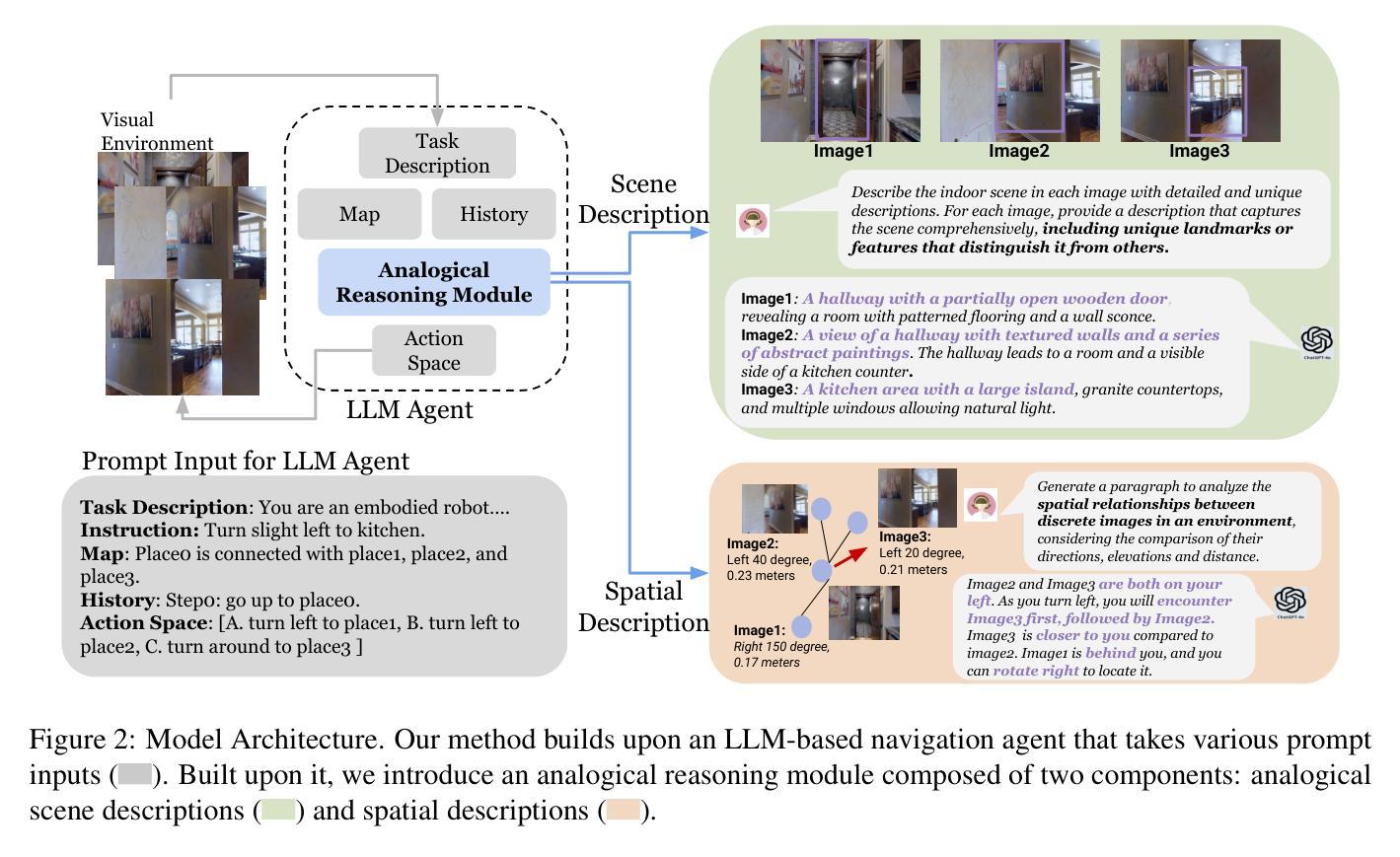 将大型语言模型(LLM)集成到嵌入式人工智能模型中的趋势日益普遍。然而,现有的基于零样本的LLM视觉与语言导航(VLN)代理要么将图像编码为文本场景描述,这可能简化了视觉细节,要么处理原始图像输入,这可能会忽略用于高级推理所需的抽象语义。在本文中,我们通过结合来自多个角度的文本描述来提高导航代理的上下文理解能力,这些描述有助于图像之间的类比推理。通过利用基于文本的类比推理,代理提高了其对全局场景的理解和空间推理能力,从而做出更准确的行动决策。我们在R2R数据集上评估了我们的方法,实验表明我们的方法在导航性能上有了显著提高。