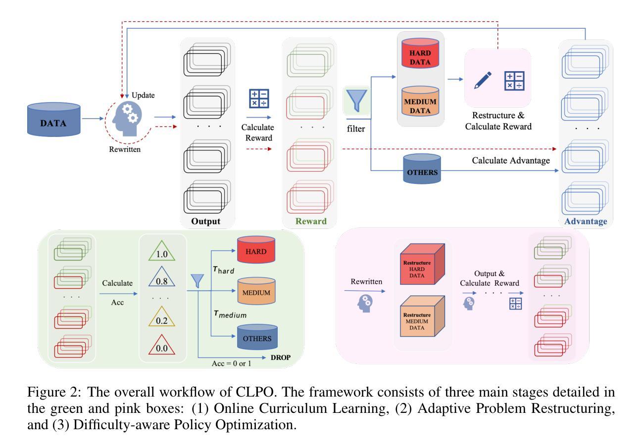 - CLPO引导自适应问题重构机制,模型充当自己的老师,促进问题的多样化并简化挑战性任务。