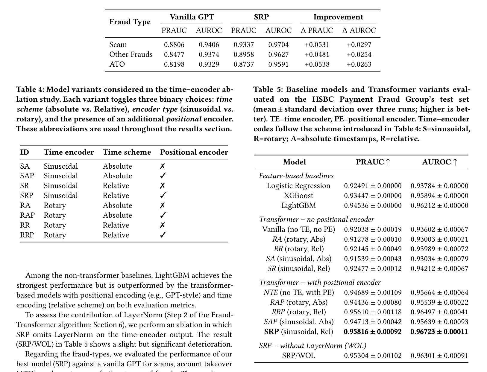 在真实世界的银行流水交易中检测支付欺诈,需要能够利用事件顺序和事件之间不规则时间间隔的模型。我们引入了FraudTransformer,这是一个序列模型,它增强了一般GPT风格的架构,包括(i)专用时间编码器,可以嵌入绝对时间戳或事件间值,(ii)学习位置编码器,可以保留相对顺序。在大型工业数据集(数千万笔交易和辅助事件)上的实验表明,FraudTransformer超越了四个强大的经典基线(逻辑回归、XGBoost和LightGBM),以及省略了时间或位置组件的转换器消融模型。在保留的测试集上,它达到了最高的AUROC和PRAUC。