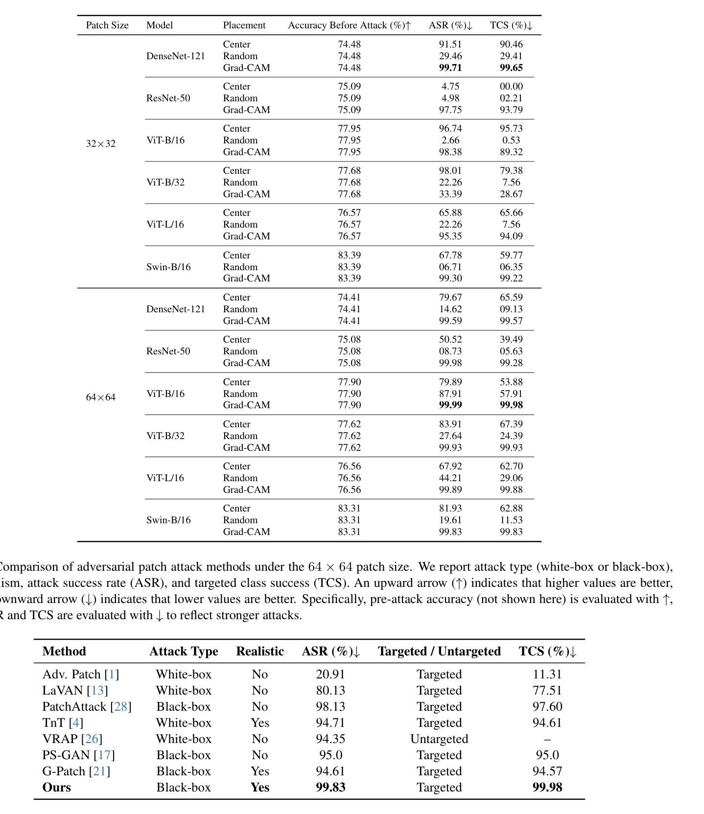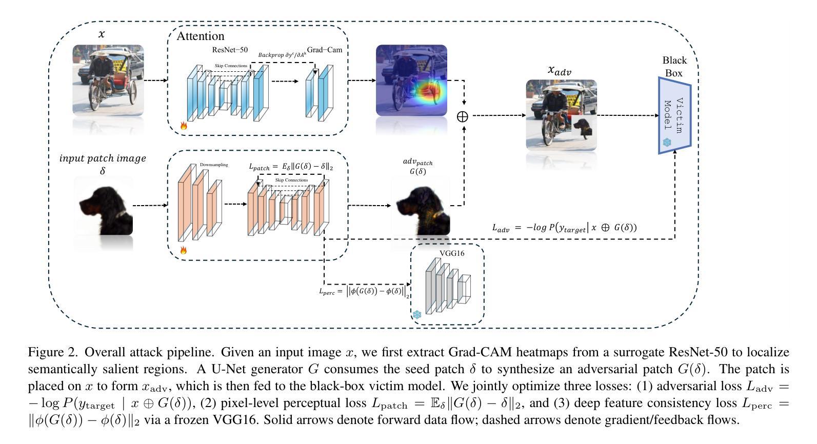 - 结合生成式U-Net设计和Grad-CAM指导的补丁放置策略,实现了攻击效果最大化并保持视觉真实性的能力。