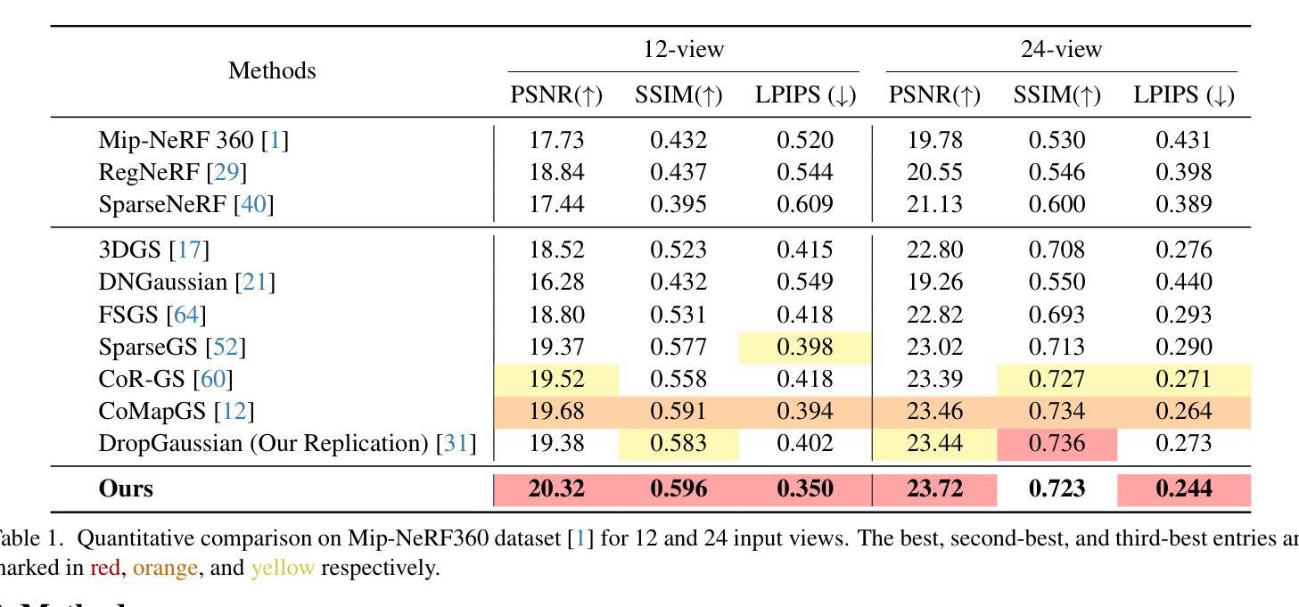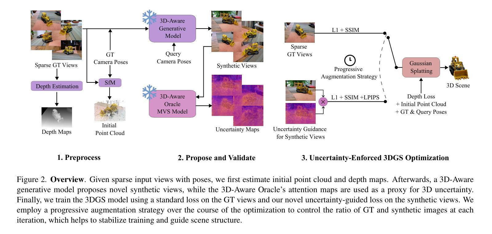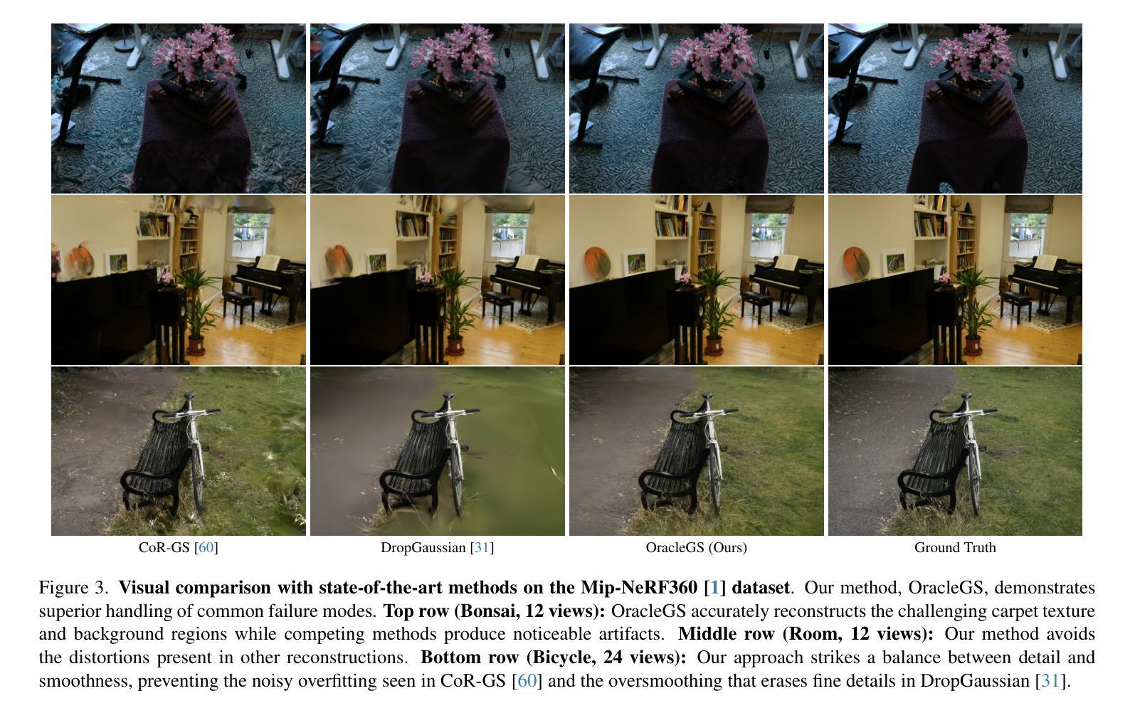 本文提出一种名为OracleGS的新框架,旨在解决稀疏视图下的新颖视角合成问题。该方法结合了生成模型的完整性与回归模型的忠实性,采用“提出并验证”的方式,利用预训练的3D感知扩散模型合成新颖视图以提出完整场景,再使用多视角立体(MVS)模型作为3D感知的顾问,验证生成视图的3D不确定性。这种方法利用注意力地图揭示哪些区域的多视角证据支持生成视图,哪些区域因遮挡、缺乏纹理或直接不一致而具有不确定性。这种不确定性信号直接指导了基于3D高斯拼贴模型的不确定性加权损失优化。此方法在包括Mip-NeRF 360和NeRF Synthetic在内的数据集上表现优于其他先进技术。