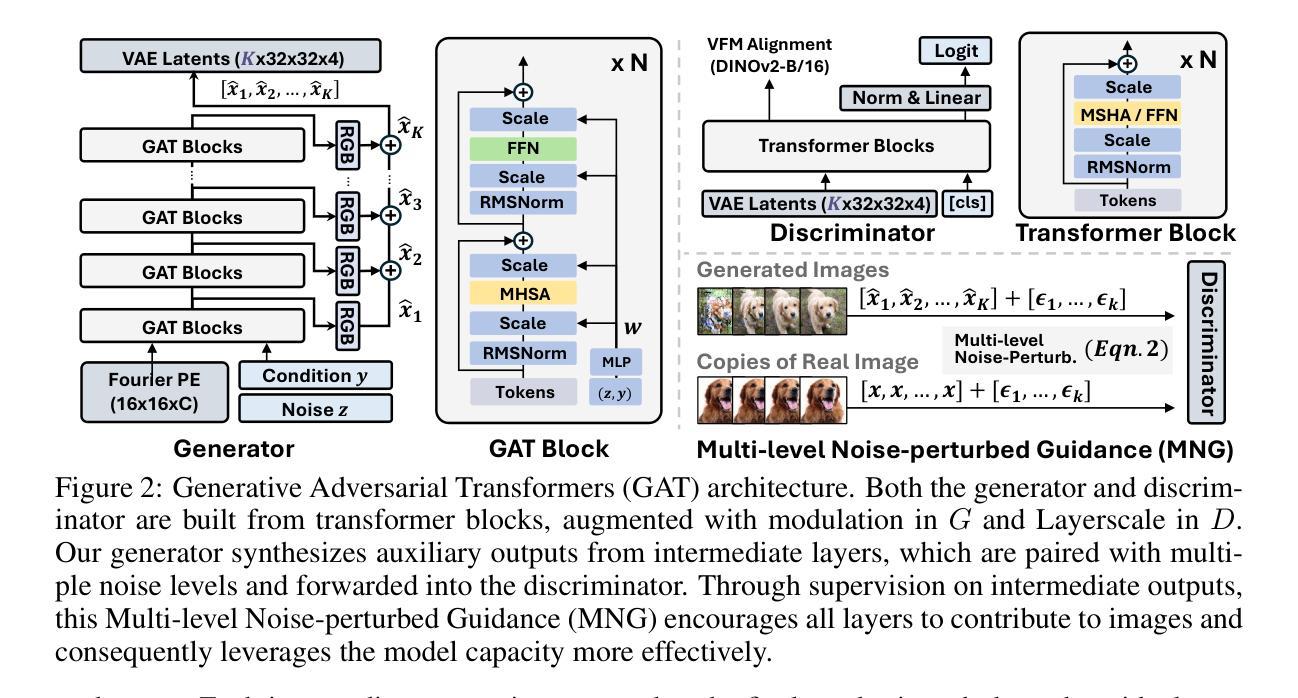 可扩展性推动了生成模型的最新发展,但对于对抗性学习,其原理仍未得到充分探索。我们通过两项在其他类型的生成模型中证明有效的设计选择来研究生成对抗网络(GANs)的可扩展性:在紧凑的变分自动编码器潜在空间中进行训练,并采用纯基于变压器的生成器和鉴别器。在潜在空间中进行训练既提高了计算效率又保持了感知保真度,这种效率与普通的变压器自然地结合在一起,其性能随计算预算而扩展。基于这些选择,我们分析了在简单扩展GAN时出现的失败模式。具体来说,我们发现生成器前几层利用不足以及网络扩展时的优化不稳定等问题。因此,我们提供了简单且适合规模的解决方案,如轻量级中间监督和宽度感知学习率调整。我们的实验表明,GAT是一种纯基于变压器和潜在空间的GANs,可以轻松地跨广泛的能力范围(S到XL)进行可靠训练。此外,GAT-XL/2在仅40个周期内就在ImageNet-256上实现了最先进的单步、有条件生成性能(FID为2.96),这是基线模型的六分之一周期。