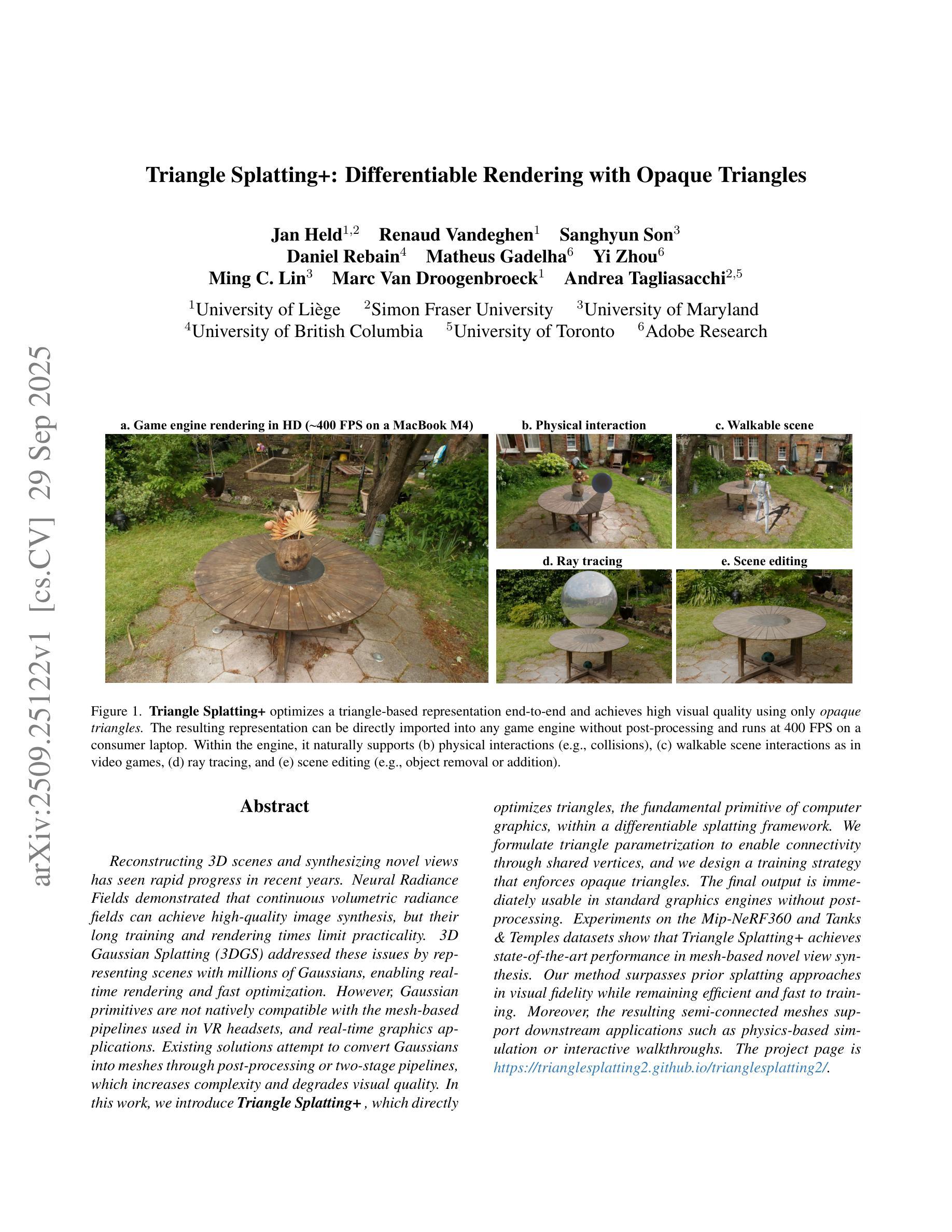 近年来,重建三维场景和合成新视角的技术取得了快速发展。神经辐射场证明连续体积辐射场可以实现高质量图像合成,但其漫长的训练和渲染时间限制了实用性。3D高斯贴合(3DGS)通过用数百万个高斯表示场景解决了这些问题,实现了实时渲染和快速优化。然而,高斯原始数据并不兼容VR头盔和实时图形应用程序所使用的基于网格的管道。现有解决方案尝试通过后期处理或两阶段管道将高斯转换为网格,这增加了复杂性并降低了视觉质量。在这项工作中,我们引入了Triangle Splatting+,它在可微分的贴合框架内直接优化计算机图形的基本原始元素——三角形。我们制定三角形参数化,通过共享顶点实现连接,并设计了一种训练策略,强制实施不透明三角形。最终输出物可立即在标准图形引擎中使用,无需后期处理。在Mip-NeRF360和Tanks & Temples数据集上的实验表明,Triangle Splatting+在基于网格的新视角合成中达到了最新技术水平。我们的方法在视觉保真度上超越了先前的贴合方法,同时保持了高效和快速的训练。此外,所得的半连接网格支持下游应用,如基于物理的模拟或交互式浏览。项目页面为https://trianglesplatting2.github.io/trianglesplatting2/。