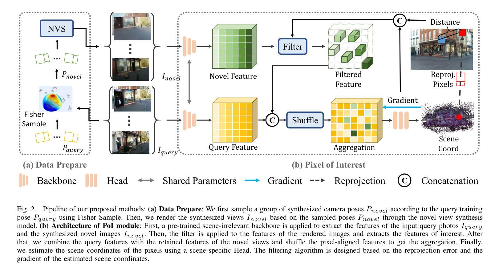 本文介绍了如何利用神经辐射场(NeRF)和三维高斯描影(3DGS)等新型视图合成(NVS)技术增强相机姿态估计。然而,NVS渲染的图像常存在模糊问题,影响了其作为相机姿态估计训练数据的可靠性。针对场景坐标回归(SCR)方法中的这一问题,本文提出了一种基于双重标准的过滤机制,该机制能在训练过程中动态识别并丢弃不符合要求的像素。同时,针对稀疏输入场景下的视觉定位问题,本文设计了一种由粗到细的感兴趣点变体,利用稀疏输入的NVS数据辅助定位任务。实验证明,该方法在室内外基准测试中都取得了卓越的效果,实现了高定位精度与计算效率。