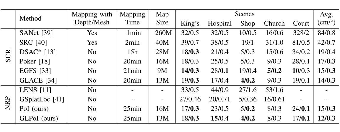 新型视图合成(NVS)技术,特别是神经辐射场(NeRF)和3D高斯喷涂(3DGS)技术,可以通过使用渲染图像扩展训练数据来增强相机姿态估计。然而,这些方法渲染的图像往往受到模糊的影响,降低了它们作为相机姿态估计训练数据的可靠性。这一局限性对于场景坐标回归(SCR)方法尤为关键,因为SCR方法旨在进行像素级3D坐标估计,而渲染伪影直接导致估计不准确。为了解决这一挑战,我们提出了一种基于双标准的过滤机制,该机制能够在训练过程中动态识别并丢弃次优像素。双标准过滤器评估两个并行指标:(1)实时SCR重投影误差和(2)坐标回归域中的梯度阈值。此外,在稀疏输入的视觉定位问题中,使用NVS生成的数据辅助定位任务将更为必要。我们设计了一种使用稀疏输入NVS的由粗到细的PoI变体来解决这个问题。室内和室外基准测试的实验结果证实了我们的方法的有效性。它在保持计算效率的同时实现了最先进的定位精度。