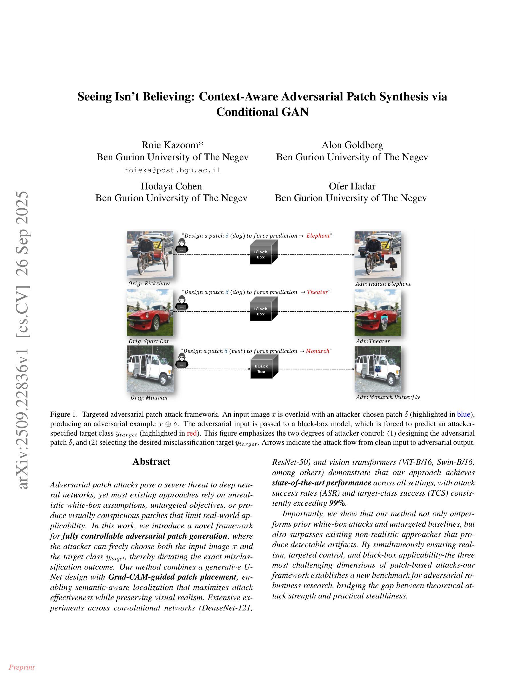 对抗性补丁攻击对深度神经网络构成了严重威胁,但大多数现有方法依赖于不切实际的白色盒子假设、非目标性目标,或产生视觉显著的补丁,限制了其在现实世界中的应用性。在这项工作中,我们引入了一个全新的可控对抗性补丁生成框架,攻击者可以自由选择输入图像x和目标类别y target,从而决定确切的误分类结果。我们的方法结合了生成式U-Net设计和由Grad-CAM引导的补丁放置,实现了语义感知的定位,最大化攻击效果的同时保持视觉真实性。在卷积网络(DenseNet-121、ResNet-50)和视觉转换器(ViT-B/16、Swin-B/16等)上的广泛实验表明,我们的方法在所有设置中都实现了最先进的性能,攻击成功率(ASR)和目标类别成功率(TCS)均超过99%。重要的是,我们证明我们的方法不仅优于先前的白色盒子攻击和非目标基线,而且超越了现有产生可检测伪影的非现实方法。通过同时确保真实性、目标控制和黑色盒子适用性——补丁攻击的三大最具挑战性的维度,我们的框架为对抗性稳健性研究建立了新的基准,缩小了理论攻击强度与实际隐蔽性之间的差距。