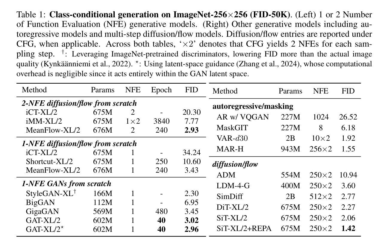 - 实验表明,GAT在广泛的容量范围内能够可靠地进行训练,并在ImageNet-256上实现了卓越的单步类条件生成性能。
