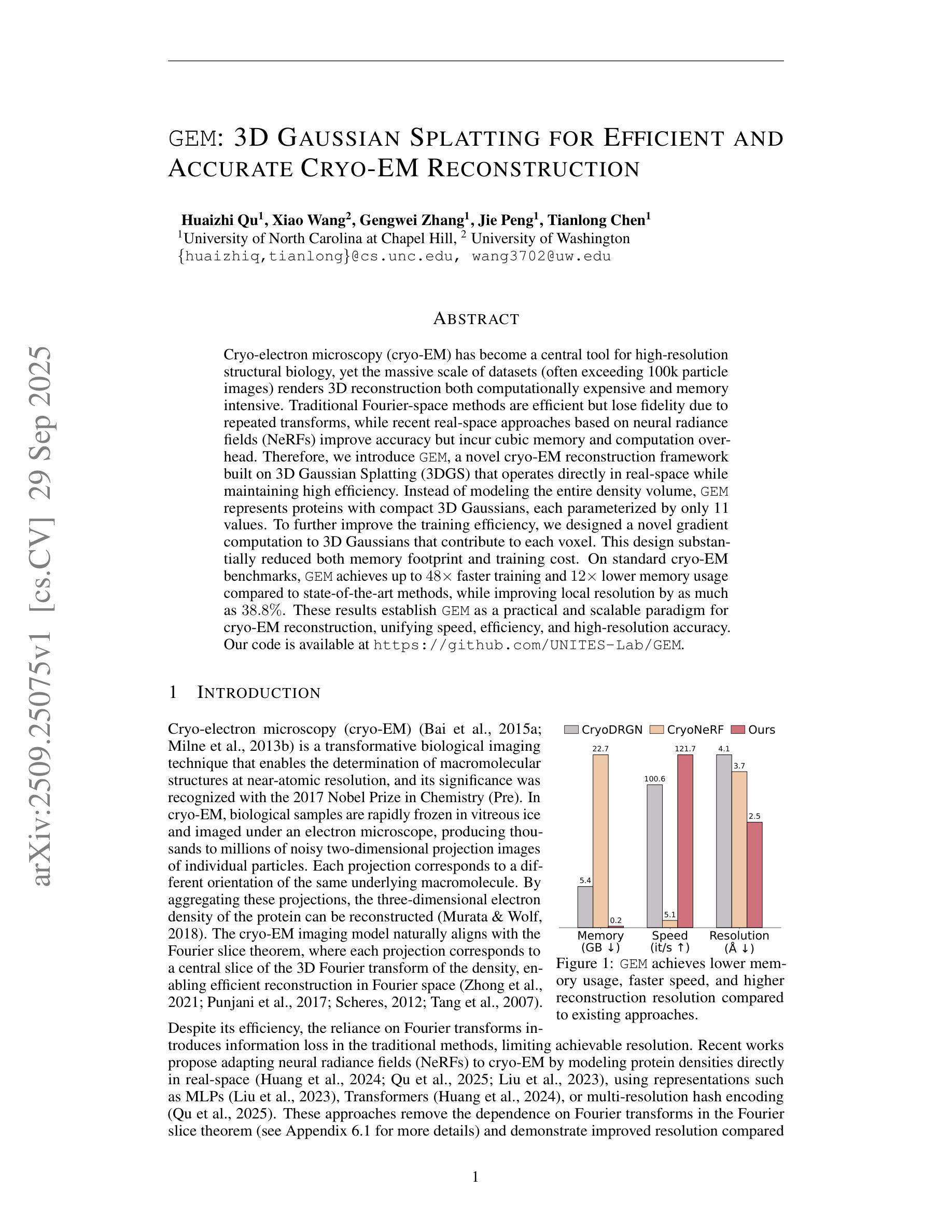 冷冻电子显微镜(cryo-EM)已成为高分辨率结构生物学的重要工具,但数据集的大规模(通常超过10万张粒子图像)使得3D重建在计算和内存方面都很昂贵。传统的傅里叶空间方法虽然效率高,但由于重复变换而失去精度,而最近基于神经辐射场(NeRFs)的实空间方法提高了准确性,但产生了立方级的内存和计算开销。因此,我们引入了GEM,这是一个新的冷冻电镜重建框架,它基于三维高斯拼贴(3DGS)技术,直接在实空间中运行,同时保持高效率。GEM不是对整个密度体积进行建模,而是用紧凑的三维高斯来表示蛋白质,每个高斯仅由11个值参数化。为了进一步改进训练效率,我们设计了一种新型的三维高斯梯度计算,为每个体素做出贡献。这一设计大大减少了内存占用和训练成本。在标准的冷冻电镜基准测试中,与最新方法相比,GEM实现了最多达48%更快的训练和12%更低的内存使用率,同时局部分辨率提高了高达38.8%。这些结果证明了GEM作为冷冻电镜重建实用且可扩展的范式,统一了速度、效率和高分辨率的准确性。我们的代码可在https://github.com/UNITES-Lab/GEM获取。