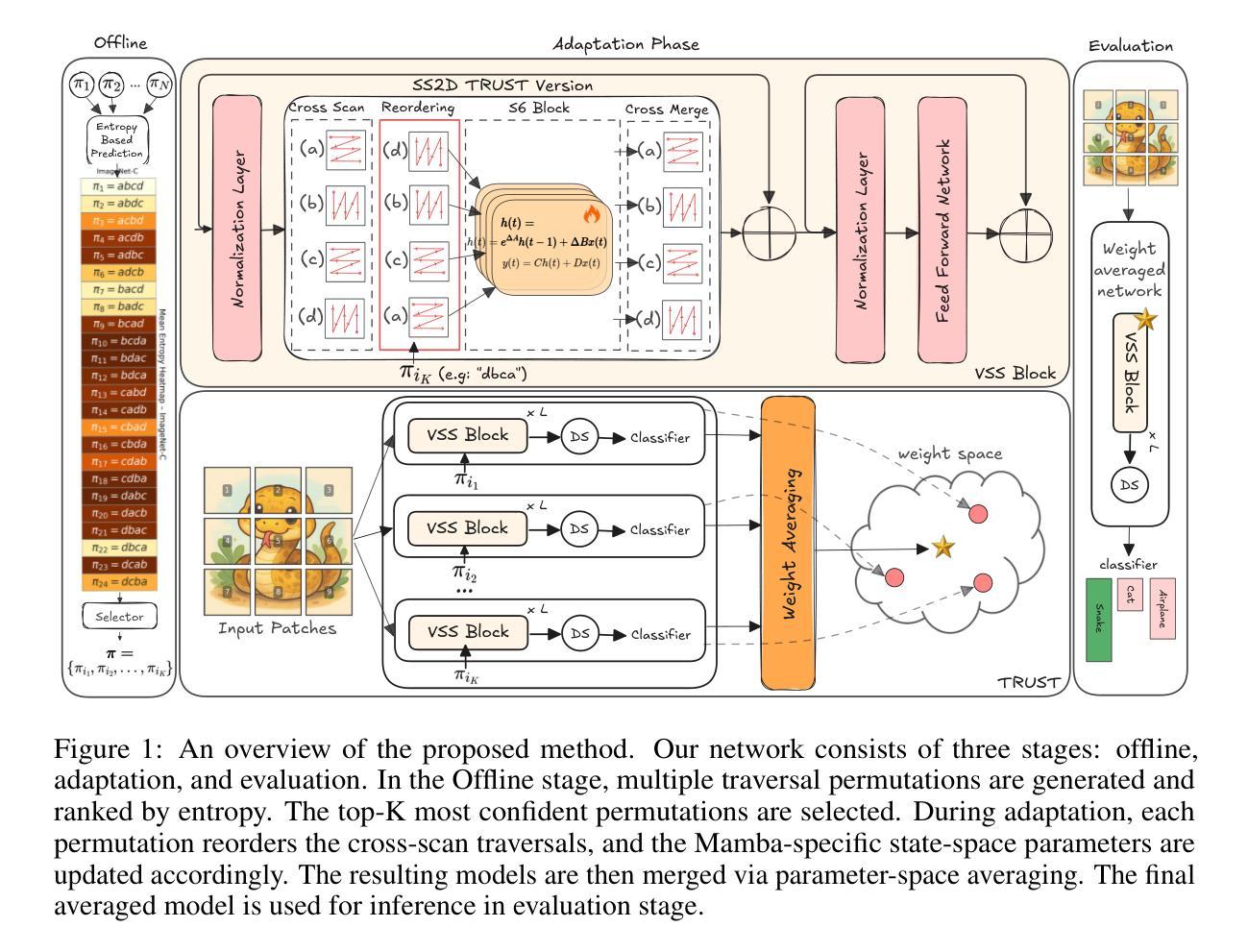 状态空间模型(SSMs)作为视觉转换器(ViTs)的有效替代方案已经出现,其中VMamba作为一种针对视觉任务设计的开创性架构尤为突出。然而,它们在分布变化下的泛化性能会显著下降。为了解决这一局限性,我们提出了名为TRUST(使用不确定性引导SSM遍历的测试时间细化)的新型测试时间适应(TTA)方法,该方法利用不同的遍历排列来生成输入图像的多个因果视角。模型预测作为伪标签来指导Mamba特定参数的更新,并且适应的权重被平均化以整合多次遍历扫描中所学习的信息。总体而言,TRUST是第一个明确利用SSMs的独特架构属性进行适应的方法。在七个基准测试上的实验表明,TRUST持续提高了稳健性并在测试中超越了现有的TTA方法。
