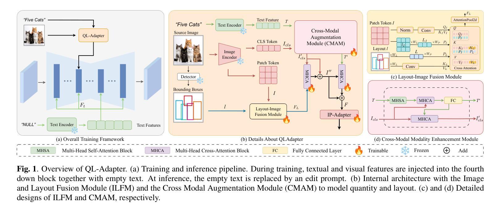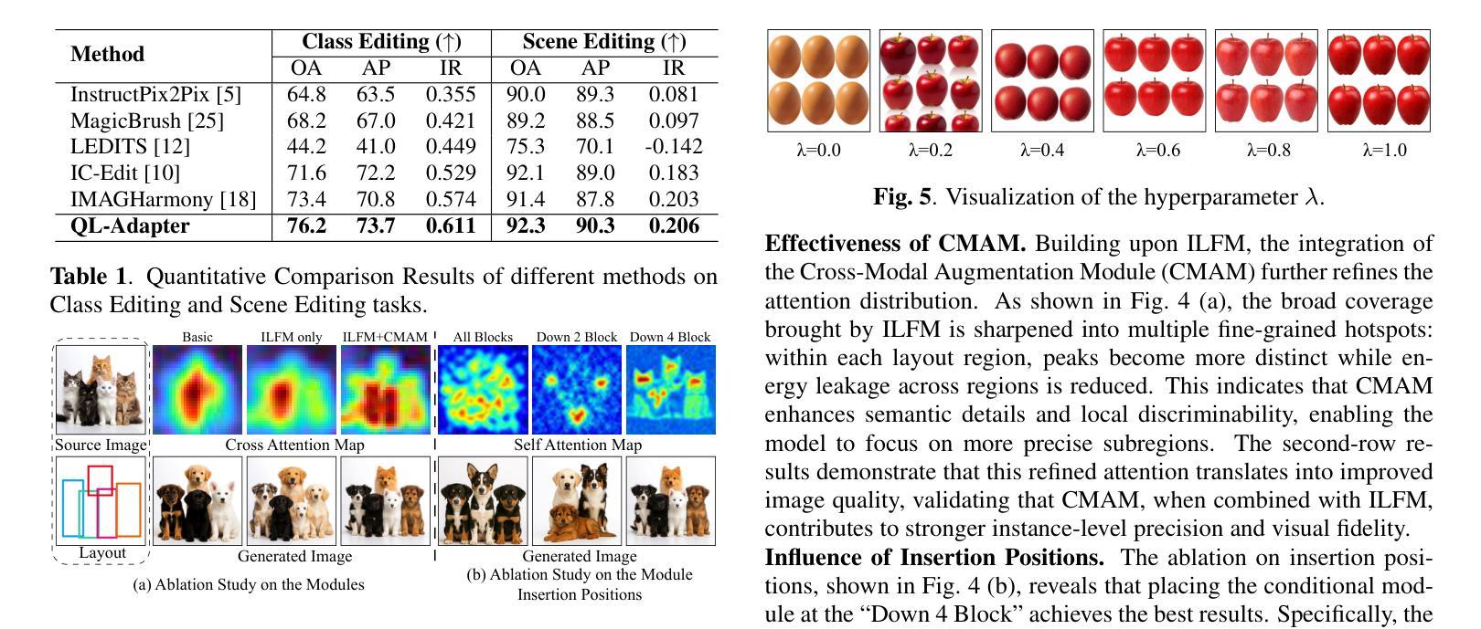 在具有多个对象的复杂场景中,使用标准CLIP文本编码器的指令驱动图像编辑往往会失败。我们提出了QL-Adapter,这是一个用于多个对象编辑的框架,解决了两个挑战:强制对象计数和空间布局,并适应各种类别。QL-Adapter包含两个核心模块:图像布局融合模块(ILFM)和跨模态增强模块(CMAM)。ILFM将布局先验与CLIP图像编码器的ViT补丁标记融合,以加强空间结构理解。CMAM将图像特征注入文本分支,以丰富文本嵌入并改善指令遵循。我们进一步构建了QL-Dataset,这是一个涵盖广泛类别、布局和计数变化的基准测试,并定义了数量布局一致图像编辑的任务(QL-Edit)。大量实验表明,QL-Adapter在QL-Edit上达到了最先进的性能,并显著优于现有模型。