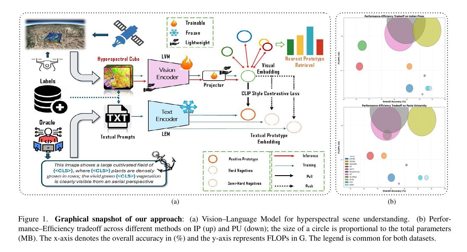 随着数据需求的持续增长,高效学习越来越依赖于高价值数据的筛选和提炼,而不是粗暴地扩大模型规模。对于高光谱图像(HSI)而言,由于每个空间位置都与数百个连续光谱通道相关联的高维三维体素结构,挑战被放大了。虽然视觉和语言模型已针对自然图像或文本任务进行了有效优化,但它们在超光谱域中的跨模态对齐仍然是一个开放且尚未充分探索的问题。在本文中,我们尝试利用CLIP风格的对比训练框架来优化用于超光谱场景理解的视觉语言模型(VLM)。我们的框架将从视觉主干中提取的体素级嵌入映射到冻结的大型嵌入模型(LEM)的潜在空间上,其中可训练探针将视觉特征与模型的文本令牌表示进行对齐。两种模态通过对比损失与精选的硬(最接近的错类)和半硬(随机干扰项)负样本以及正样本对进行对齐。为了进一步增强对齐效果,引入了编码类语义的描述性提示,这些提示充当超光谱图像嵌入的结构锚点。可以看到,该方法仅更新总参数的0.07%,但取得了最新性能。例如,在印第安松(IP)上,该模型相对于单模态和多模态基线提高了+0.92的整体精度(OA)和+1.60的卡帕系数(κ),而在帕维亚大学(PU)数据集上,它提供了+0.69的OA和+0.90的卡帕系数增益。此外,这是通过使用参数集实现的,几乎是DCTN的50倍小,并且是SS-TMNet的90倍小。
