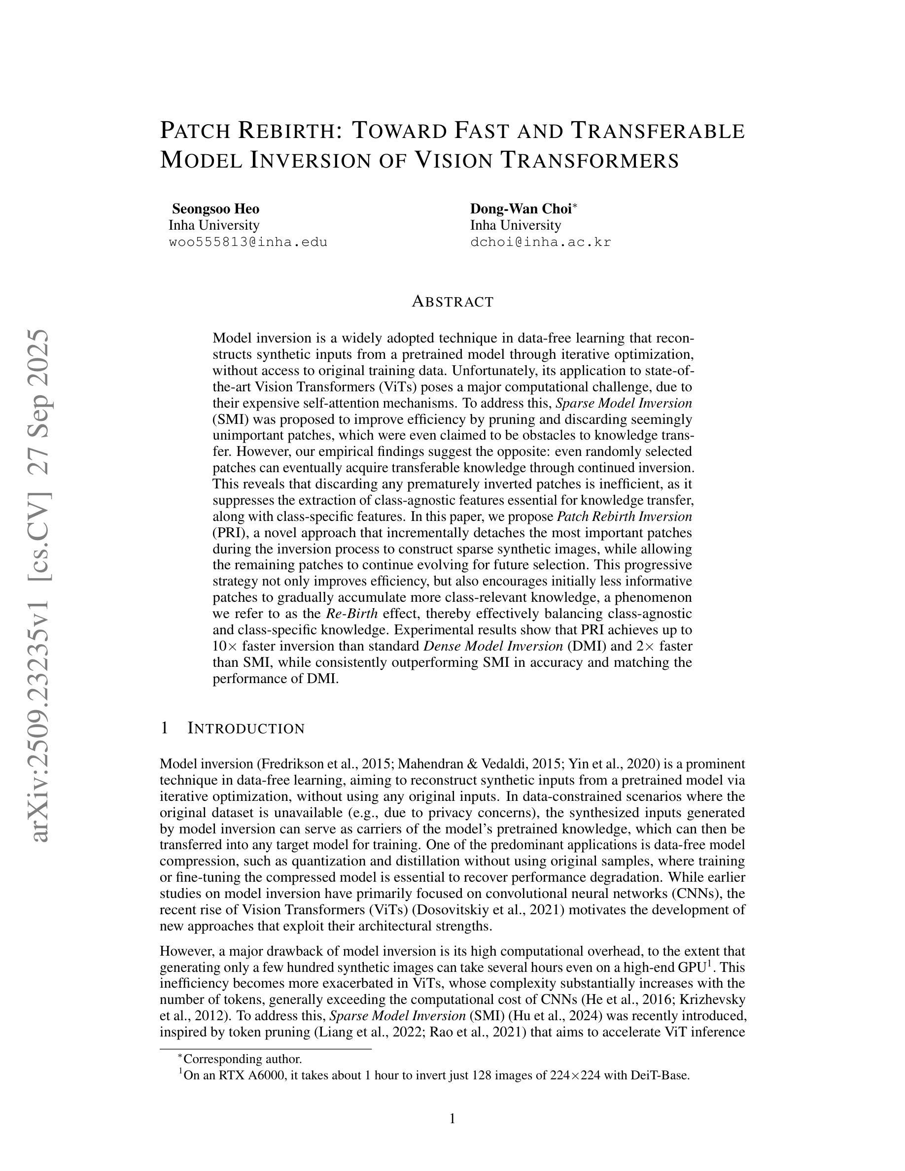 模型反转是一种无数据学习的广泛采用的技术,它通过迭代优化从预训练模型中重建合成输入,无需访问原始训练数据。然而,将其应用于最先进的视觉变压器(ViT)带来了巨大的计算挑战,因为它们的自注意力机制非常昂贵。为了解决这一问题,提出了稀疏模型反转(SMI)来提高效率,通过修剪和丢弃似乎不重要的补丁,这些补丁甚至被声称是知识转移的障碍。然而,我们的实证发现恰恰相反:即使随机选择的补丁也可以通过持续的反转最终获得可转移的知识。这表明,提前丢弃任何反转的补丁都是低效的,因为它会抑制类无关特征和类特定特征的提取,这对于知识转移至关重要。在本文中,我们提出了Patch重生反转(PRI)这一新方法,它在反转过程中逐步剥离最重要的补丁来构建稀疏合成图像,同时允许剩余补丁继续演化以供未来选择。这种渐进的策略不仅提高了效率,还鼓励最初信息较少的补丁逐渐积累更多与类别相关的知识,我们将这一现象称为“重生效应”,从而有效地平衡了类无关和类特定的知识。实验结果表明,PRI的反转速度比标准的Dense Model Inversion(DMI)快10倍,比SMI快2倍,同时在准确性方面始终优于SMI,并匹配DMI的性能。