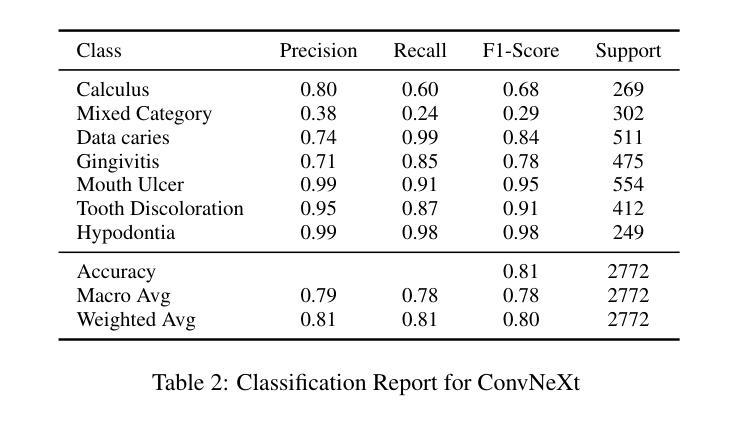 结果:ConvNeXt在验证准确率方面表现最佳,达到81.06%,其次是BEiT(80.00%)和Swin Transformer(79.73%),三者均表现出较高的F1分数。ViT和DeiT的准确率分别为79.37%和78.79%,但两者在处理与龋齿相关的类别时尤其困难。