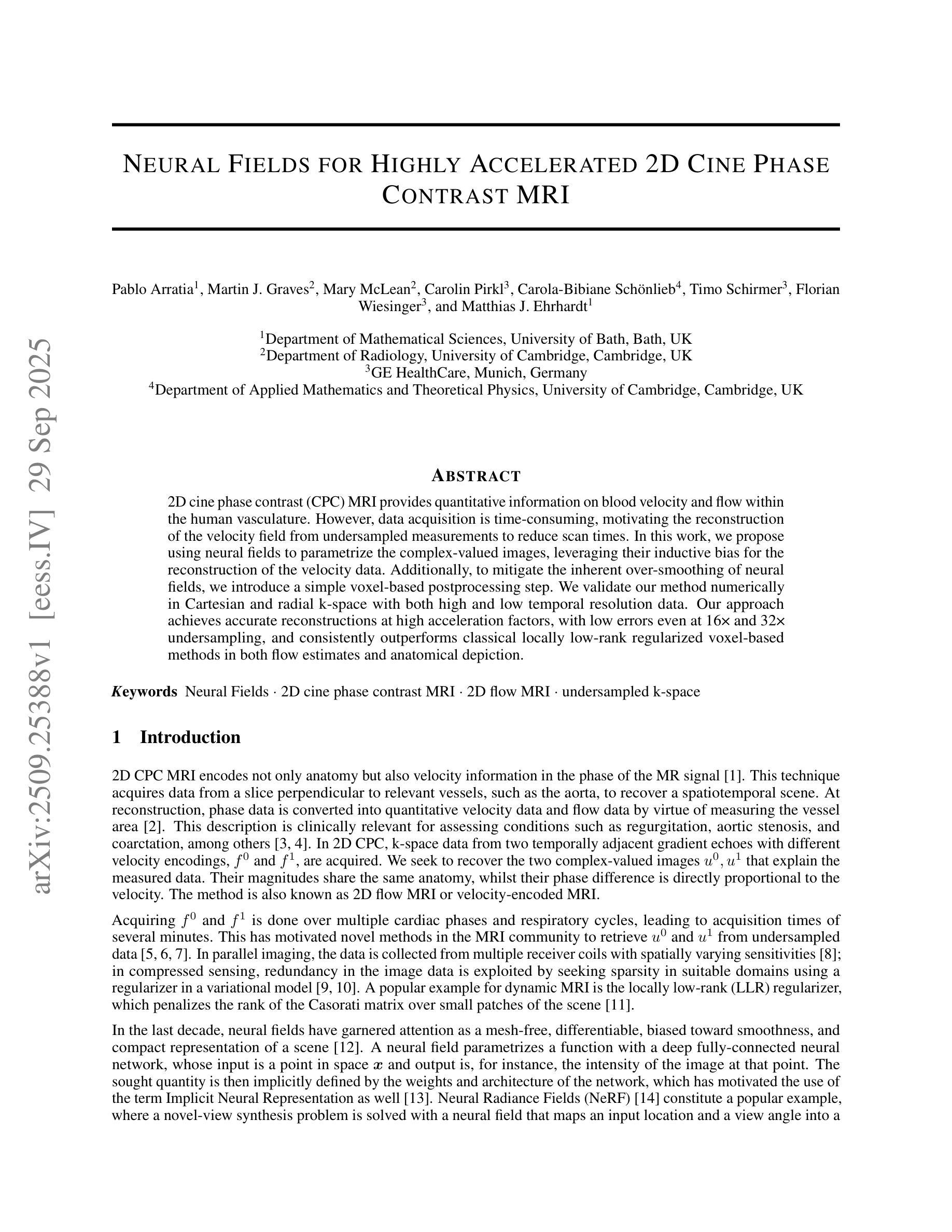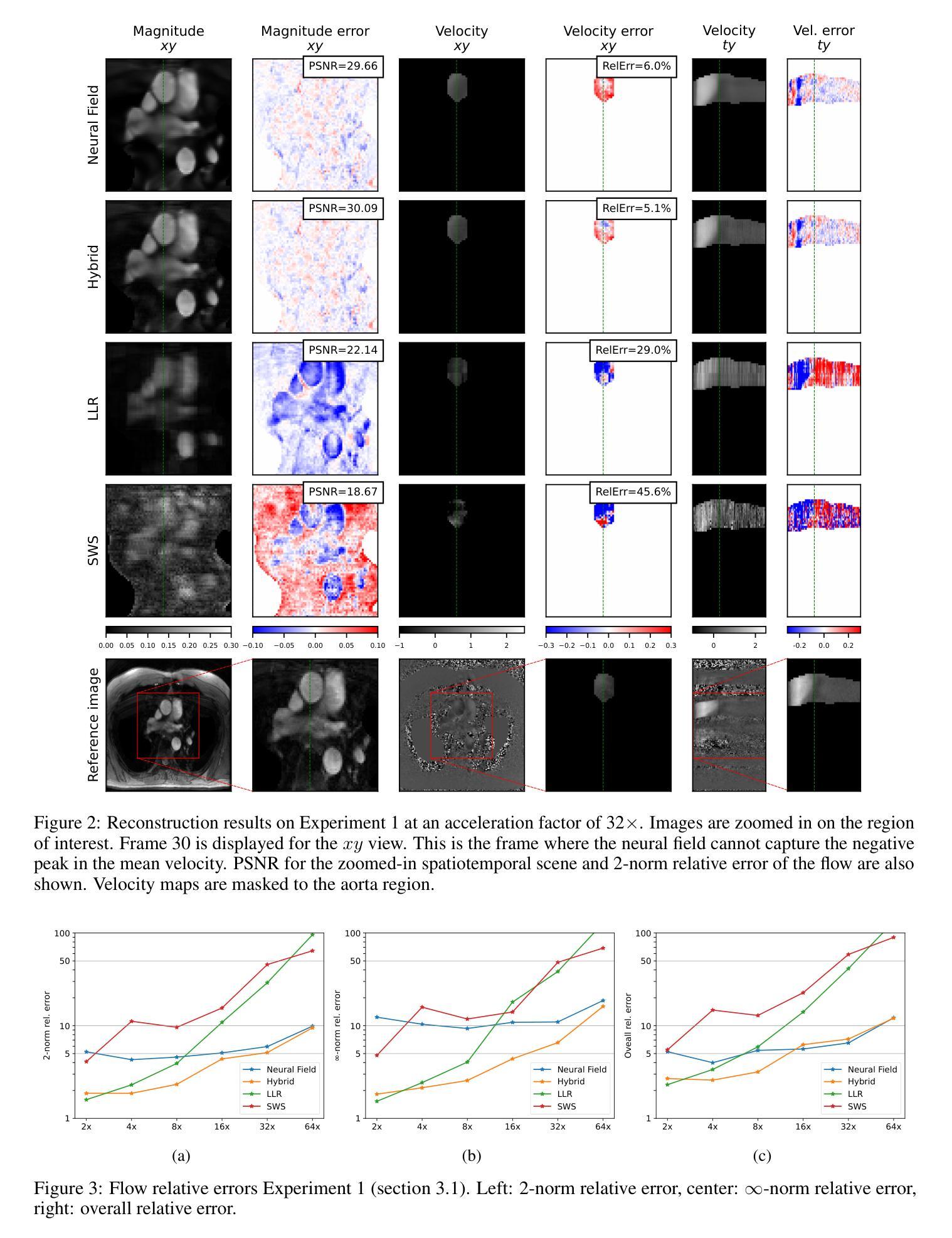 基于二维电影相位对比MRI的血液速度和血流定量信息重建。研究中提出了利用神经网络参数化重建血流速度数据,并用像素级的后处理减少数据平滑化过度问题。研究成功实现高速采样因子下的精确重建,显著优于局部低秩正则化的像素级方法。