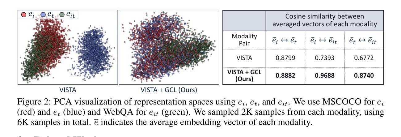 尽管跨模态检索模型(例如CLIP)在性能上持续有所提升,但在处理由融合图像文本模态组成的检索关键词时(例如包含图像和文本的Wikipedia页面),其性能却出现下降。为了应对这一关键挑战,最近开始探索多模态检索,以开发一种能够在不同模态组合之间进行检索的统一单一检索模型。一种常见的方法涉及构建新的图像-文本三元组集合(例如,给定查询图像,检索一对图像和文本)。然而,这种方法需要仔细筛选以确保数据集的质量,并且无法推广到未见过的模态组合。为了克服这些局限性,本文提出了广义对比学习(GCL),这是一种新的损失形式,可以在不需要新的数据集筛选的情况下提高多模态检索性能。具体来说,GCL通过在mini-batch内所有模态之间强制执行对比学习,利用现有的图像字幕配对数据集来学习统一表示空间。我们在M-BEIR、MMEB和CVR基准测试上展示了使用现成的多模态检索模型(例如VISTA、CLIP和TinyCLIP)时GCL的有效性,其性能得到了持续的提升。