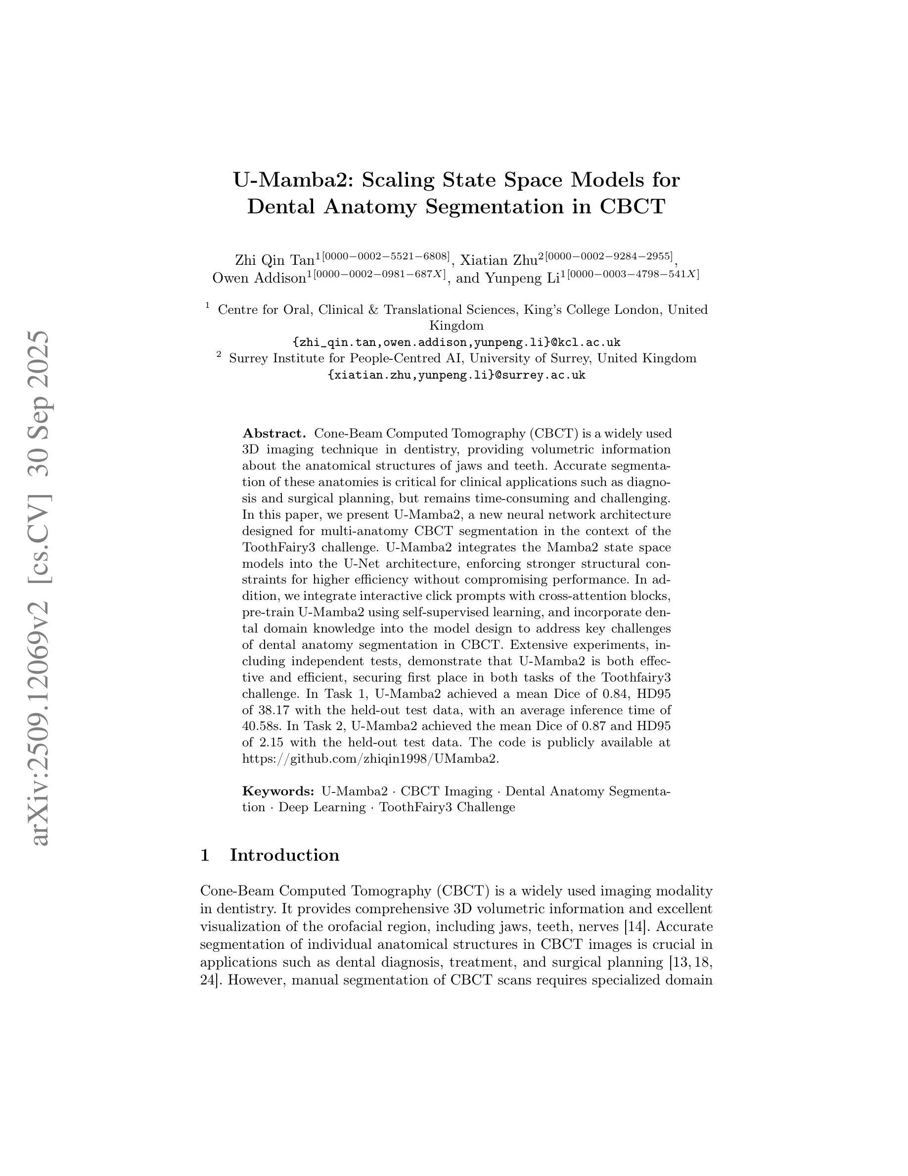 CBC(锥束计算机断层扫描)三维成像技术在牙齿修复领域广泛应用,本文提出了一种名为U-Mamba2的新神经网络架构用于CBC中的多解剖学结构分割。该架构结合了Mamba2状态空间模型和U-Net架构,增强了结构约束以提高效率而不损失性能。通过集成交互点击提示与交叉注意力块、利用自监督学习进行预训练、并将牙科领域知识融入模型设计,解决了CBC中牙齿解剖学结构分割的关键挑战。实验证明,U-Mamba2既有效又高效,在ToothFairy3挑战中取得了第一名。在任务1中,U-Mamba2在独立测试数据上的平均Dice系数为0.84,HD95为38.17,平均推理时间为40.58秒。在任务2中,U-Mamba2的Dice系数和HD95分别为0.87和2.15。相关代码已公开在GitHub上。