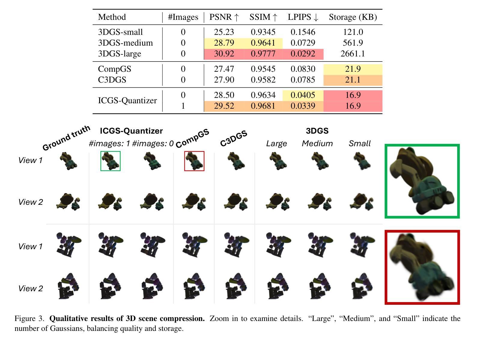 - ICGS-Quantizer降低了存储需求至千字节范围,同时保持了视觉保真度。它能在解码时根据图像进行场景解码,增强了适应场景变化的能力。