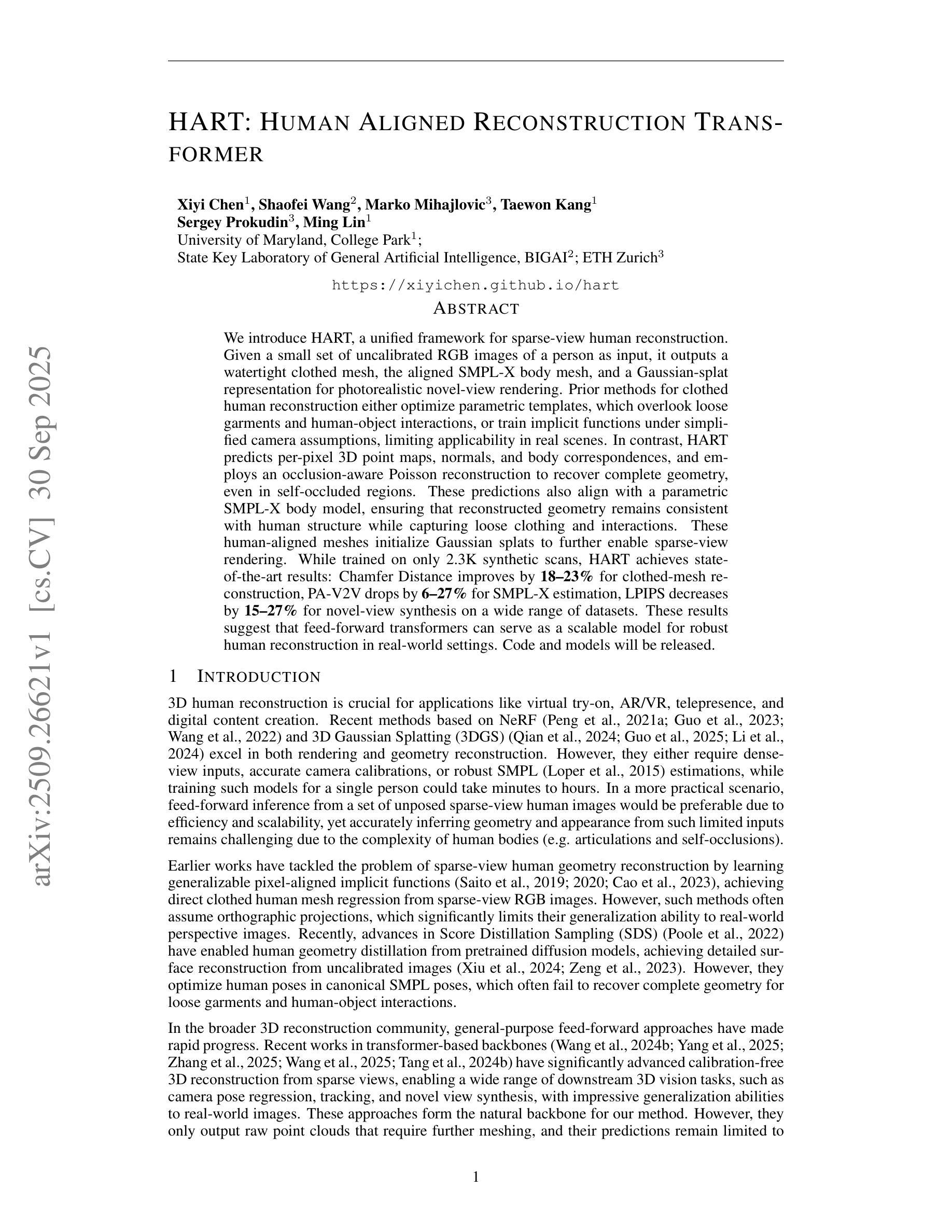 - HART是一个统一框架,用于稀疏视角下的三维人体重建,接受少量RGB图像作为输入。