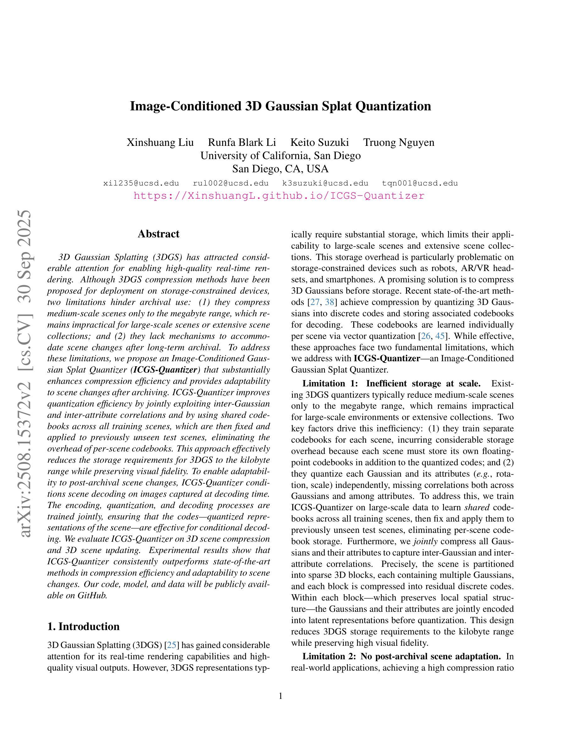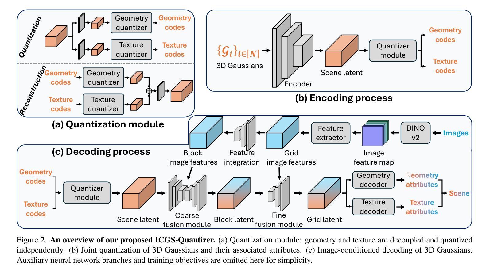 - 图像条件高斯模糊量化器(ICGS-Quantizer)被提出以提高压缩效率和适应存档后的场景变化。它通过利用高斯之间的相关性以及跨场景共享的代码本提高了量化效率。