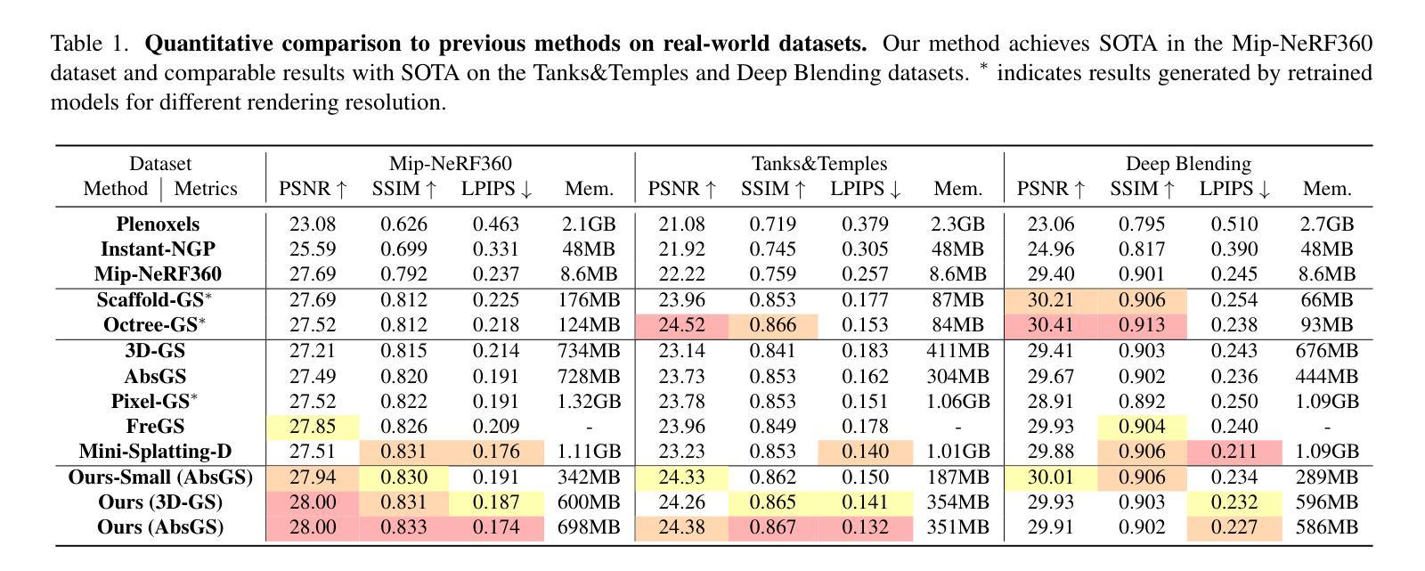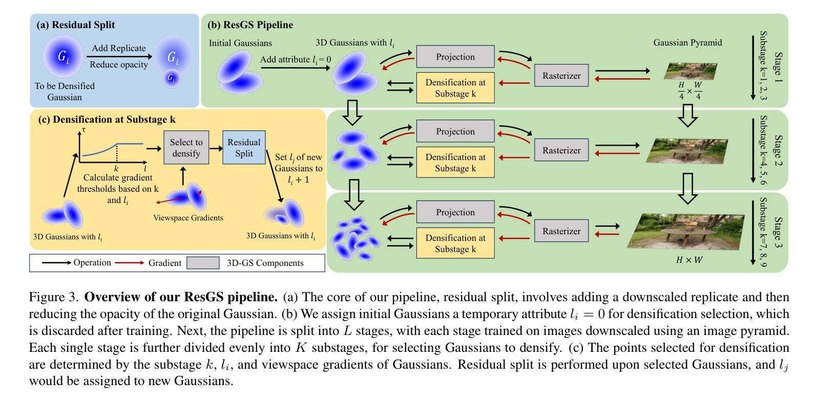 本文介绍了三维高斯拼贴(3D-GS)在新型视图合成中的优势,但也指出了其捕捉丰富细节和完整几何形状的困难。分析表明,3D-GS的密集化操作缺乏适应性,面临几何覆盖与细节恢复的困境。为解决这一问题,本文提出了一种新型的密集化操作——残差分割,通过添加降维的高斯残差来增强适应性。为支持此方法,本文还提出了一种名为ResGS的管道,集成高斯图像金字塔进行渐进监督,并实现了优先选择随时间对粗糙高斯进行密集化的选择方案。实验表明,该方法达到了先进的渲染质量,并在各种3D-GS变体上应用残差分割,证明了其通用性和在基于3D-GS的应用中的广泛应用潜力。