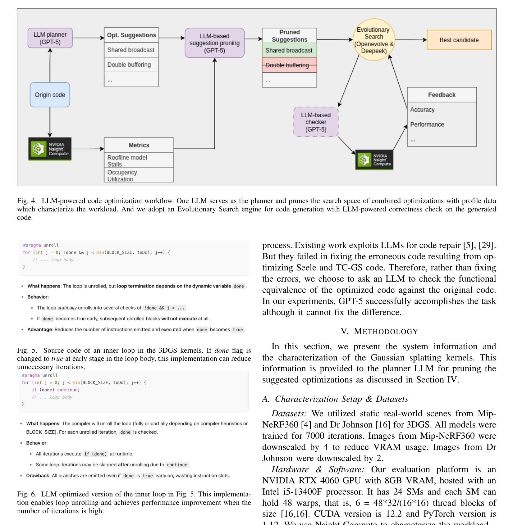 3D高斯展平(3DGS)是一种对新型视图合成和实时渲染有深远影响的变革性技术。鉴于其重要性,人们已尝试多种方法提升其性能。然而,随着GPU架构的日益复杂和性能调整参数搜索空间的不断扩大,这是一个具有挑战性的任务。尽管手动优化已经实现了显著的加速,但它们需要领域专业知识,而且优化过程可能非常耗时且易出错。在本文中,我们提出利用大型语言模型(LLMs)分析和优化高斯展平内核。据我们所知,这是首次使用LLMs优化高度专业化的现实世界GPU内核的工作。我们揭示了使用LLMs进行代码优化的复杂性,并分析了LLMs的代码优化技术。我们还提出了与LLMs协作以进一步利用其能力的方法。对于MipNeRF360数据集上的原始3DGS代码,LLMs实现了显著的加速,使用Deepseek加速19%,使用GPT-5加速24%,展示了不同LLMs的不同能力。通过从性能分析器提供额外信息,LLM优化代码的性能提升平均增强到最高达42%和38%。相比之下,我们最好的手动优化版本可以将性能提高最高达48%和平均提高39%,这表明仍有超出当前LLMs能力的优化空间。另一方面,即使在具有算法优化的新提出的3DGS框架Seele上,LLMs仍然可以进一步提高其性能6%,这表明有专家错过的优化机会。这突显了领域专家与LLMs合作的潜力。