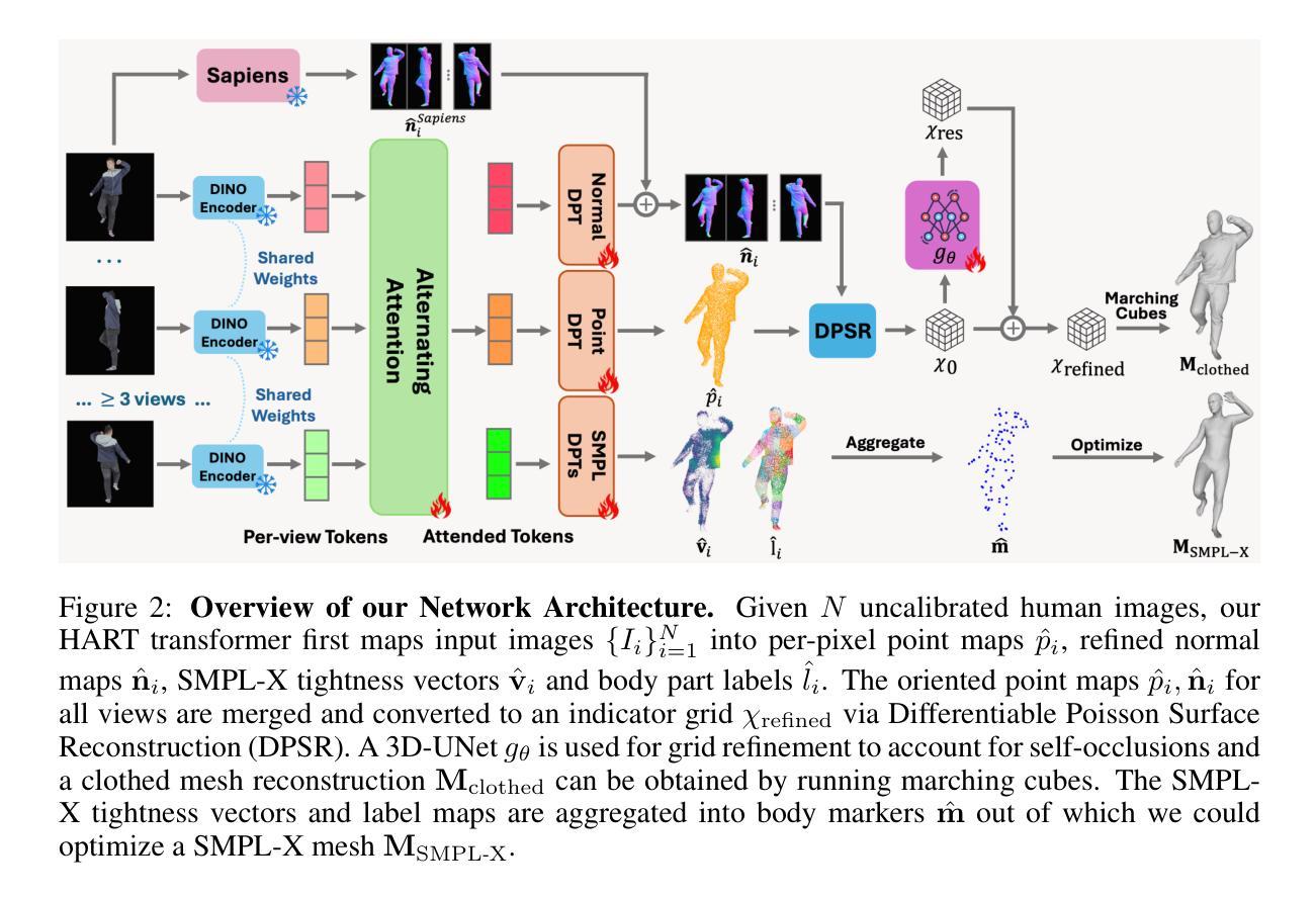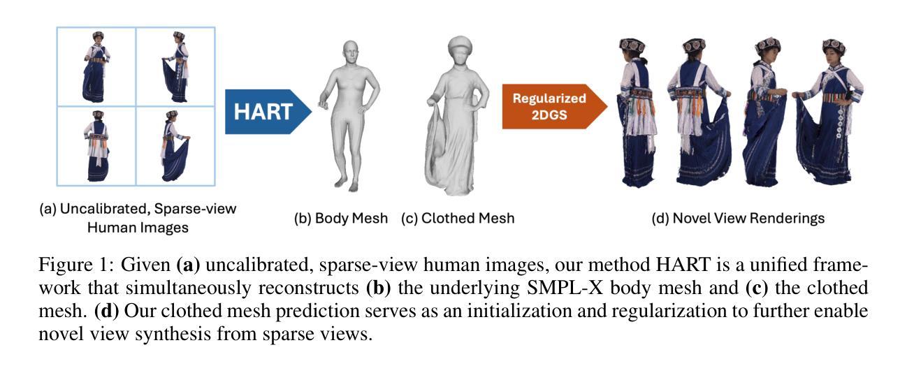 该论文提出了一种名为HART的统一框架,用于稀疏视角下的三维人体重建。该框架接受少量未校准的RGB图像作为输入,输出包括贴合人体的衣物网格、对齐的SMPL-X身体网格以及用于真实感渲染的高斯贴片表示。相较于以往的方法,HART能更准确地预测每一点的3D点图、法线和身体对应关系,并采用遮挡感知的Poisson重建算法恢复自遮挡区域的完整几何结构。此外,HART还能确保重建的几何结构符合人体结构,并捕捉宽松衣物和互动信息。这些人体对齐的网格初始化了高斯贴片,进一步实现了稀疏视角下的渲染。尽管仅在2.3K合成扫描上进行训练,但HART在各项评估指标上均达到或超越了现有技术水平。该研究表明,前馈变压器可作为面向现实世界的稳健人体重建的可扩展模型。