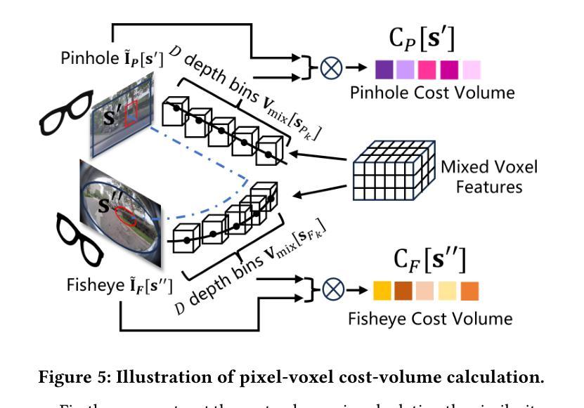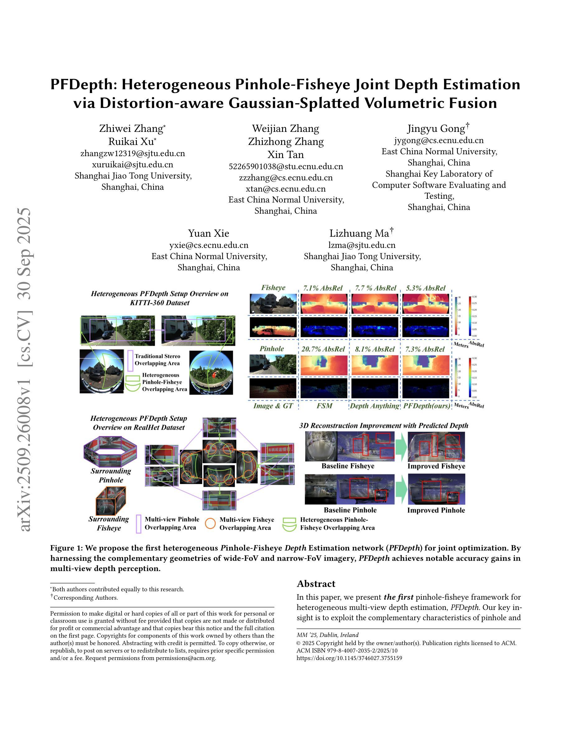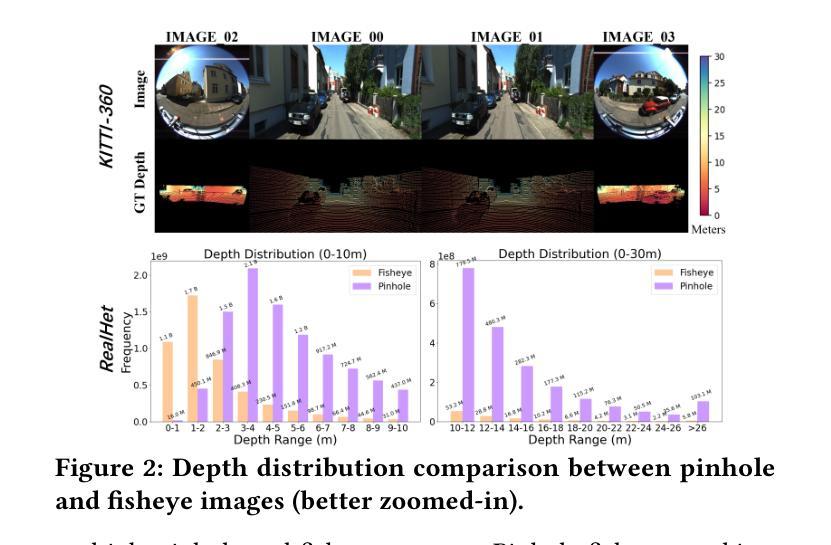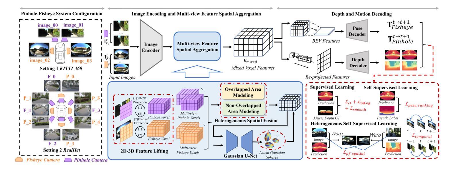 本文中,我们首次提出了用于异质多视图深度估计的针孔鱼眼框架,名为PFDepth。我们的关键见解是利用针孔图像和鱼眼图像的互补特性(无畸变与畸变、小与大视野、远与近场)进行联合优化。PFDepth采用一种统一架构,能够处理具有不同内在和外在参数的针孔和鱼眼相机的任意组合。在PFDepth中,我们首先从每个异质视图中显式提取2D特征,并将其提升到标准的3D体积空间中。然后,设计了一个名为Heterogeneous Spatial Fusion的核心模块,用于处理和融合重叠和非重叠区域的失真感知体积特征。此外,我们将传统的体素融合巧妙地重新制定为一种新型3D高斯表示,其中可学习的潜在高斯球体能够动态适应局部图像纹理,以实现更精细的3D聚合。最后,将融合后的体积特征呈现为多视图深度图。通过广泛的实验,我们证明PFDepth在KITTI-360和RealHet数据集上的性能达到了当前主流深度网络的前沿水平。据我们所知,这是关于异质针孔鱼眼深度估计的首次系统研究,既具有技术新颖性,又提供了有价值的经验见解。