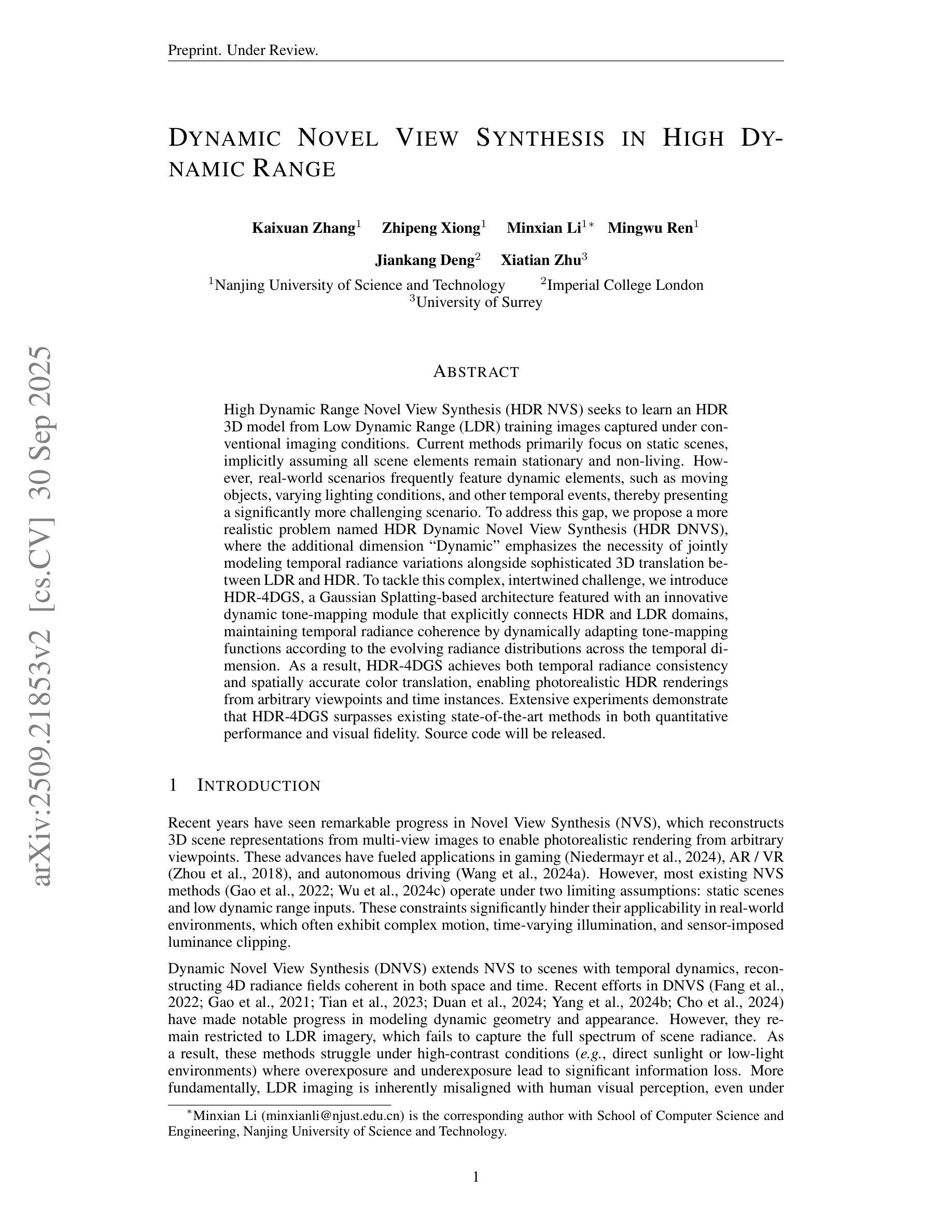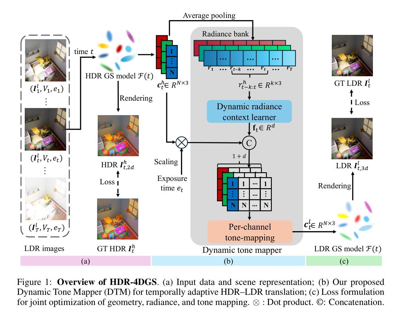 高动态范围新颖视图合成(HDR NVS)旨在从在常规成像条件下捕获的低动态范围(LDR)训练图像中学习HDR 3D模型。当前的方法主要关注静态场景,隐含地假设所有场景元素都是静止的且非生物。然而,现实世界中的场景通常包含动态元素,例如移动物体、变化的照明条件和其他临时事件,因此呈现了一个更具挑战性的场景。为了解决这个问题,我们提出了一个更现实的问题,称为HDR动态新颖视图合成(HDR DNVS),其中“动态”这个额外的维度强调了同时建模时间辐射变化以及LDR和HDR之间复杂的三维转换的必要性。为了应对这一复杂且相互关联的挑战,我们引入了HDR-4DGS,这是一个基于高斯飞溅的架构,具有创新的动态色调映射模块,该模块显式连接HDR和LDR域,通过动态适应色调映射功能来保持时间辐射一致性,根据时间维度上不断变化的辐射分布。因此,HDR-4DGS实现了时间辐射一致性和空间精确的颜色转换,支持从任意观点和时间实例进行逼真的HDR渲染。大量实验表明,HDR-4DGS在定量性能和视觉保真度方面都超越了现有的最先进方法。源代码将发布。