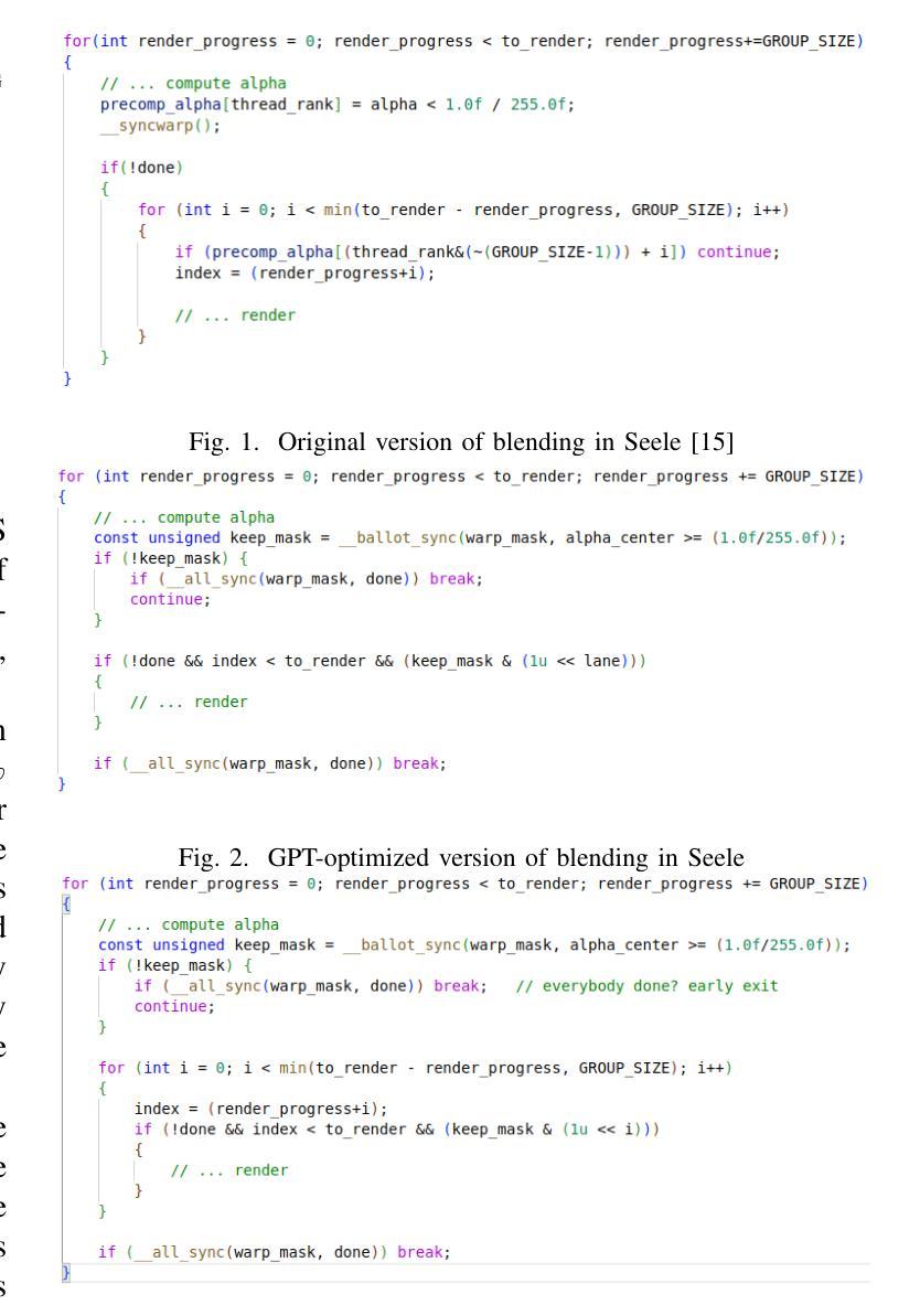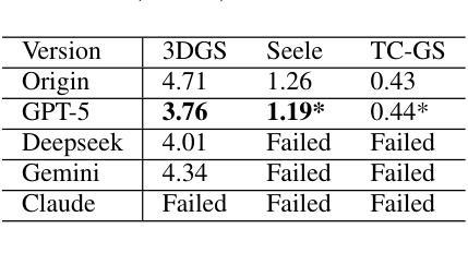- LLMs对原始3DGS代码实现了显著的速度提升,其中Deepseek和GPT-5分别提升了19%和24%。
