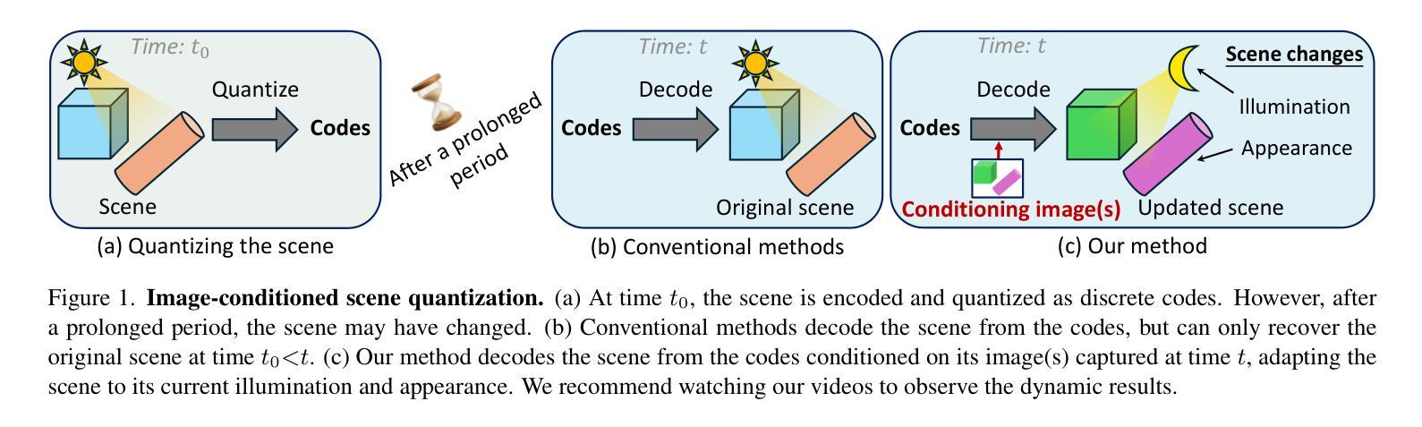 3D高斯贴图(3DGS)因其能够实现高质量实时渲染而备受关注。虽然已有针对存储受限设备部署的3DGS压缩方法被提出,但存在两个限制阻碍了其存档使用:(1)它们仅能将中等规模的场景压缩到兆字节范围,对于大规模场景或广泛的场景集合来说仍然不切实际;(2)它们缺乏在长期存档后适应场景变化的机制。为了解决这些限制,我们提出了一种图像条件高斯贴图量化器(ICGS-Quantizer),它大大提高了压缩效率,并为存档后的场景变化提供了适应性。ICGS-Quantizer通过联合利用高斯之间和属性之间的相关性,并使用所有训练场景的共同代码本,提高了量化效率。这些代码本在训练过程中固定下来,并应用于先前未见过的测试场景,消除了为每个场景准备代码本的开销。这种方法有效地将3DGS的存储需求降低到千字节范围,同时保持视觉保真度。为了使存档后的场景变化具有适应性,ICGS-Quantizer根据解码时捕获的图像进行场景解码。编码、量化和解码过程联合训练,确保场景的量化表示代码对于条件解码是有效的。我们评估了ICGS-Quantizer在三维场景压缩和三维场景更新方面的表现。实验结果表明,ICGS-Quantizer在压缩效率和适应场景变化方面始终优于最先进的方法。我们的代码、模型和数据将在GitHub上公开可用。