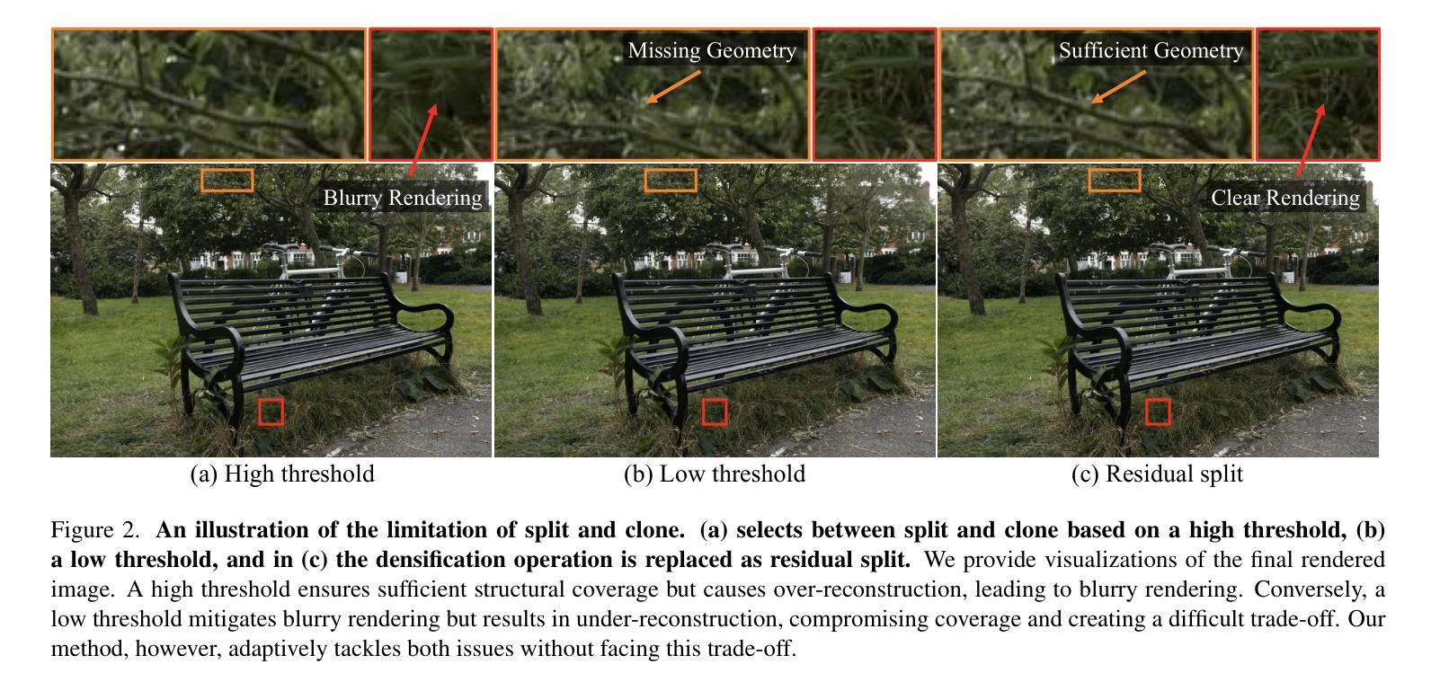 - 引入了一种新的密集化操作——残差分割,通过添加降维的高斯残差来提高适应性。