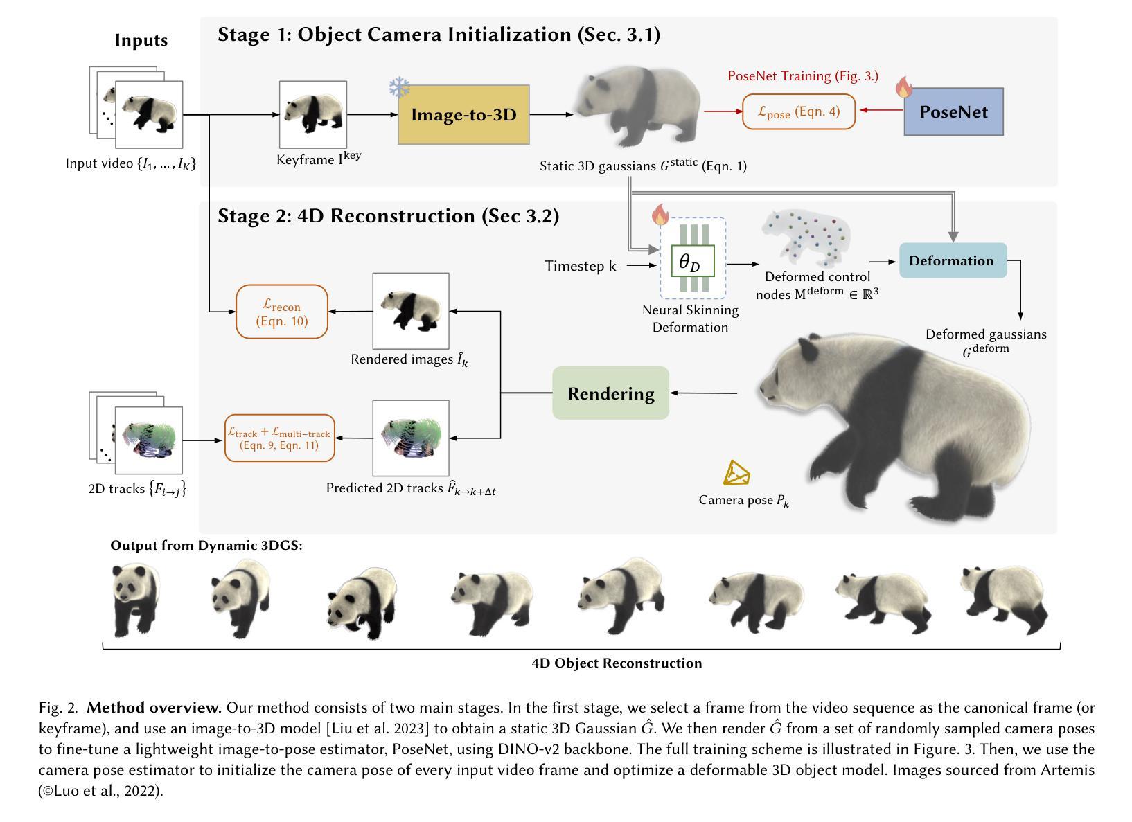 PAD3R是一种从随机捕捉的单目视频中重建可变形3D物体的方法。该方法能处理长时间序列的视频,包含物体的显著变形、大规模相机移动和有限的视野覆盖,这对于传统系统是一大挑战。其核心在于训练一个个性化的、以物体为中心的姿态估计器,由预训练的图像到三维模型进行监督。这引导了对可变形三维高斯表示的进一步优化。优化还通过在整个输入视频上的长期二维点跟踪进行进一步规范。通过结合生成先验知识和可微分渲染,PAD3R能够重建出高保真、灵活表现的物体三维表示,且不受类别限制。广泛的定性和定量结果表明,PAD3R稳健且能在具有挑战性的场景中良好地推广,突显其在动态场景理解和三维内容创建方面的潜力。