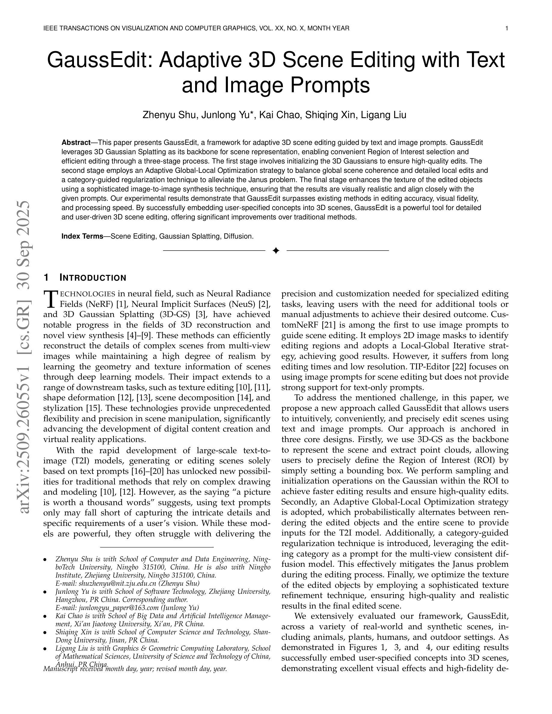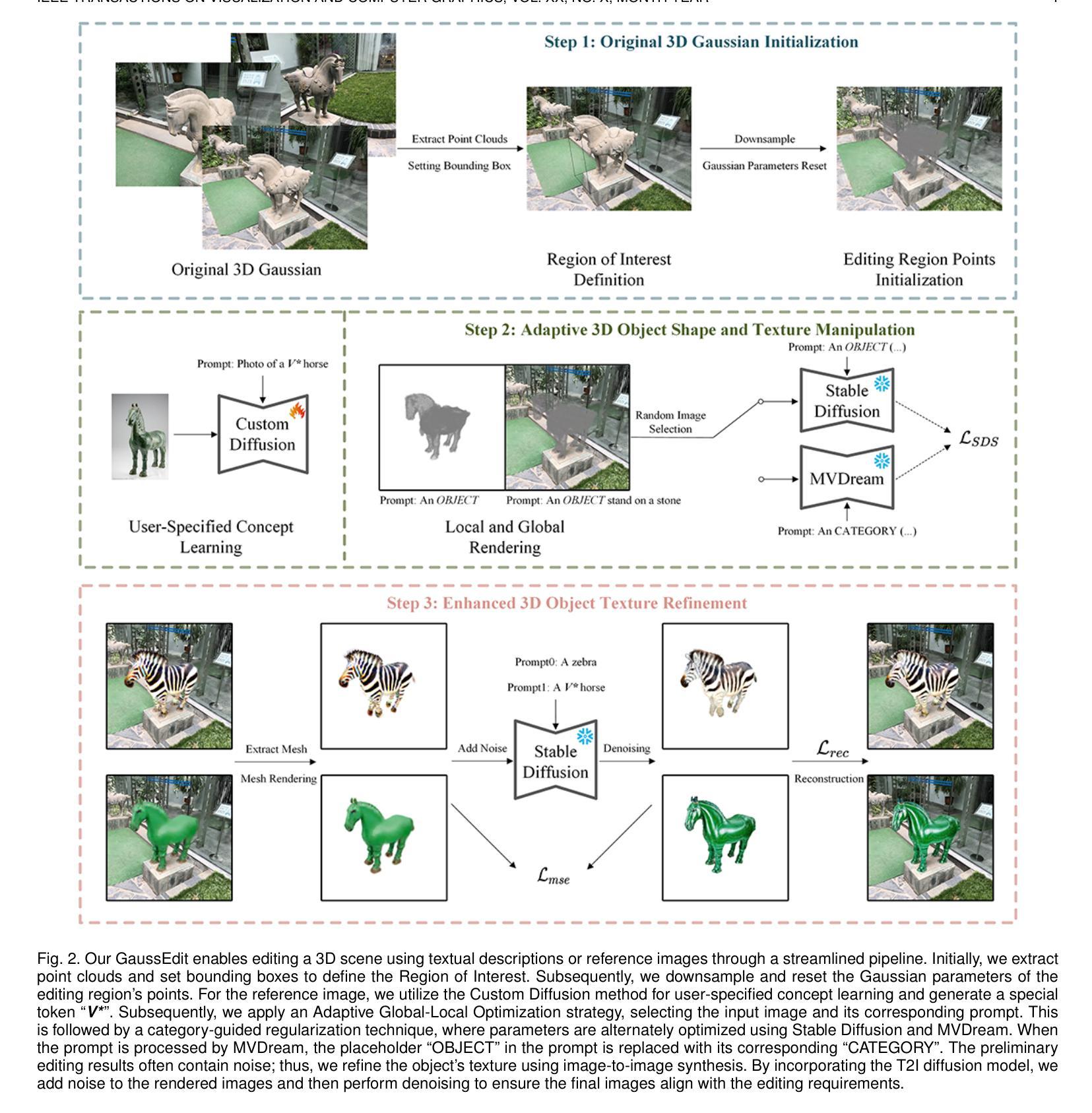 本文介绍了GaussEdit,这是一个通过文本和图像提示引导的自适应3D场景编辑框架。GaussEdit利用3D高斯拼贴作为其场景表示的核心,通过三阶段过程实现方便的感兴趣区域选择和高效编辑。第一阶段涉及初始化3D高斯,以确保高质量的编辑。第二阶段采用自适应全局-局部优化策略,以平衡全局场景连贯性和详细的局部编辑,并采用类别指导正则化技术来缓解 Janus 问题。最后一个阶段使用先进的图像到图像合成技术增强编辑对象的纹理,确保结果视觉逼真并与给定的提示紧密对齐。我们的实验结果表明,GaussEdit在编辑精度、视觉保真度和处理速度方面超过了现有方法。通过将用户指定的概念成功嵌入到3D场景中,GaussEdit是一个强大的工具,用于详细和用户驱动的3D场景编辑,对传统方法实现了重大改进。