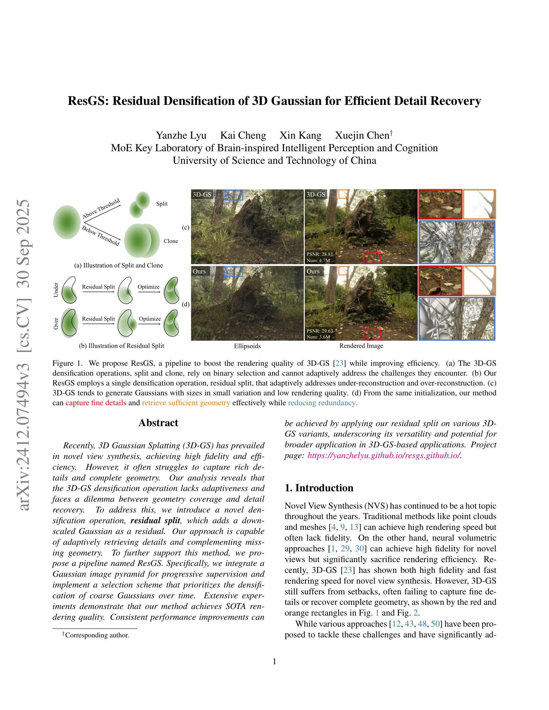 最近,3D高斯拼贴(3D-GS)在新型视图合成中盛行,实现了高保真和高效性。然而,它在捕捉丰富细节和完整几何结构方面常常遇到困难。我们的分析表明,3D-GS稠密化操作缺乏适应性,面临几何覆盖与细节恢复的困境。为了解决这一问题,我们引入了一种新型的稠密化操作,即残差分割,其添加一个降尺度的高斯作为残差。我们的方法能够自适应地检索细节并补充缺失的几何结构。为了进一步支持此方法,我们提出了一种名为ResGS的管道。具体来说,我们结合了高斯图像金字塔进行渐进监督,并实现了优先选择随时间对粗高斯进行稠密化的选择方案。大量实验表明,我们的方法达到了先进的渲染质量。将我们的残差分割应用于各种3-GS变体,可以实现持续的性能改进,这突显了其在基于3D-GS的更广泛应用中的通用性和潜力。