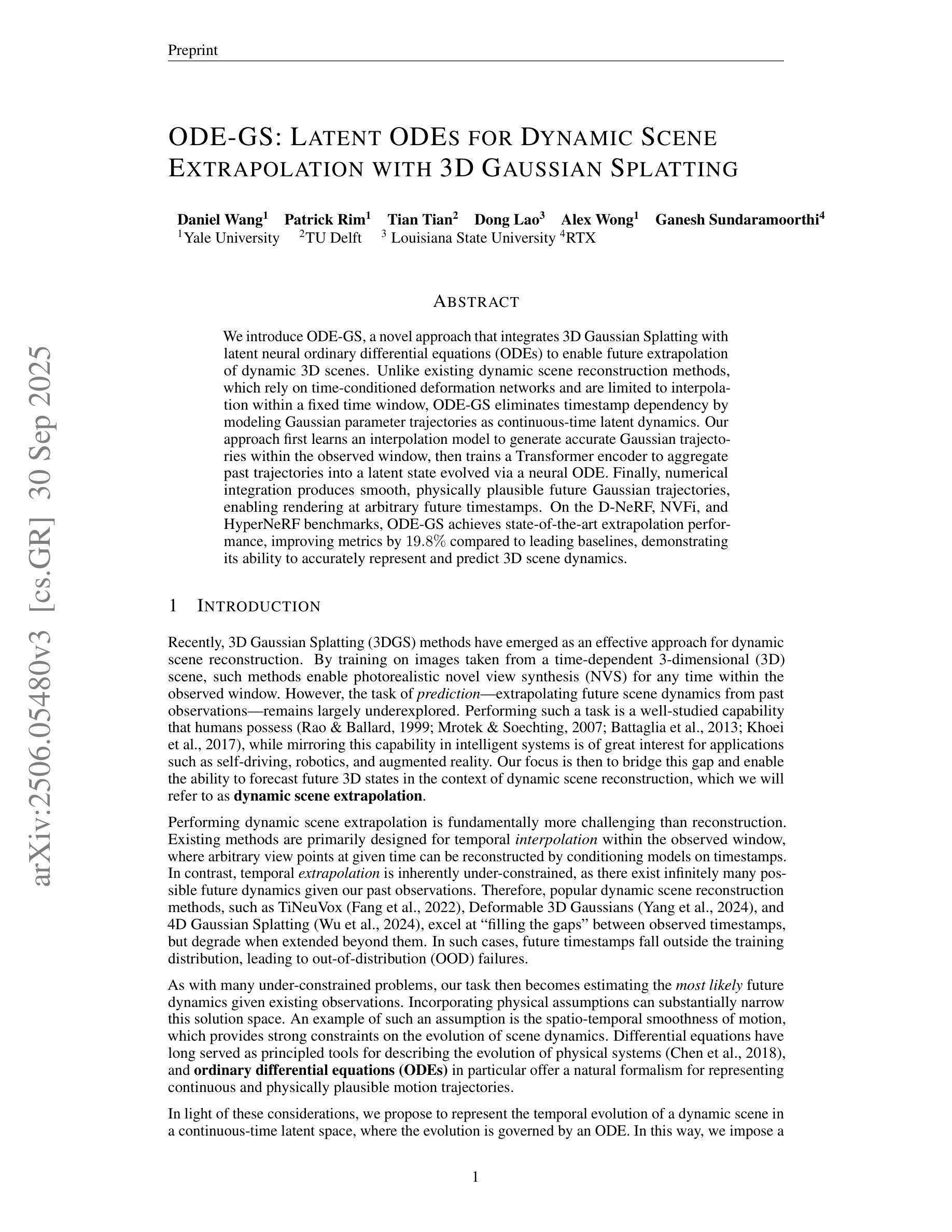 我们介绍了ODE-GS,这是一种将3D高斯摊铺与潜在神经常微分方程(ODEs)相结合的新型方法,能够对动态3D场景进行未来外推。与现有的依赖于时间条件变形网络且仅限于固定时间窗口内的插值方法的动态场景重建方法不同,ODE-GS通过模拟高斯参数轨迹作为连续时间的潜在动态,消除了时间戳依赖。我们的方法首先学习一个插值模型,在观察窗口内生成准确的高斯轨迹,然后训练一个Transformer编码器,将过去轨迹聚集到一个通过神经ODE演化的潜在状态。最后,数值积分产生平滑且物理上合理的未来高斯轨迹,可以在任意未来时间戳进行渲染。在D-NeRF、NVFi和HyperNeRF基准测试中,ODE-GS达到了最先进的预测性能,与主要基线相比提高了指标达到19.8%,这证明了其准确表示和预测3D场景动态的能力。