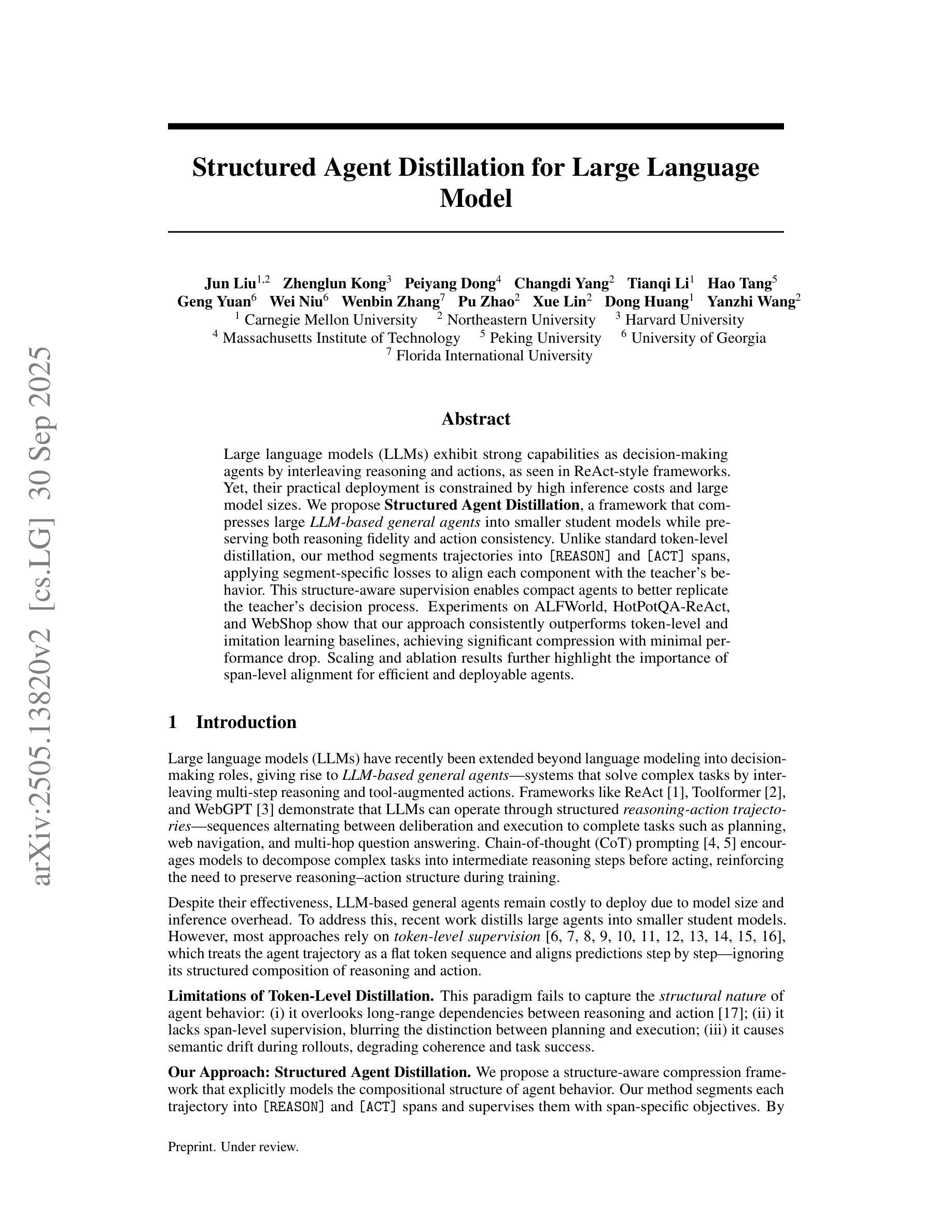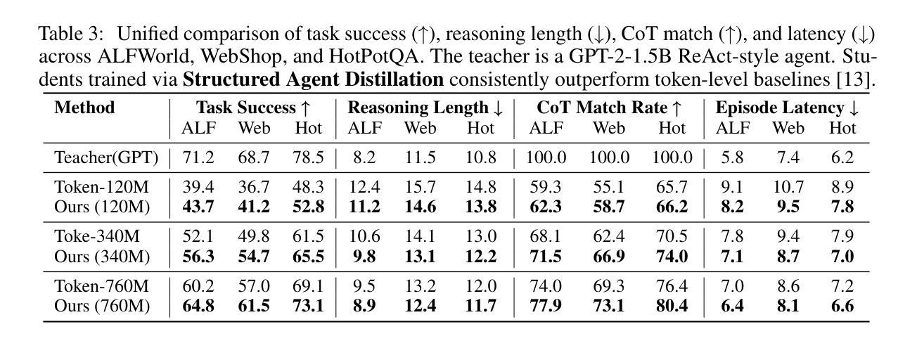 大型语言模型(LLMs)通过融合推理与行动展现出强大的决策能力,如ReAct框架所示。然而,其实践部署受限于高推理成本和庞大的模型规模。我们提出结构化代理蒸馏框架,它能将大型LLM代理压缩成较小的学生模型,同时保持推理的保真度和行动的连贯性。不同于标准的token级蒸馏,我们的方法将轨迹分段为推理和行动区间,并应用特定区间的损失来使每个组件与教师的行为对齐。这种结构化的监督使得紧凑的代理能更好地复制教师的决策过程。在ALFWorld、HotPotQA-ReAct和WebShop的实验表明,我们的方法始终优于token级和模仿学习的基线,实现了显著压缩和极小性能损失。比例和消融结果进一步突显了区间级对齐对于高效和可部署代理的重要性。
