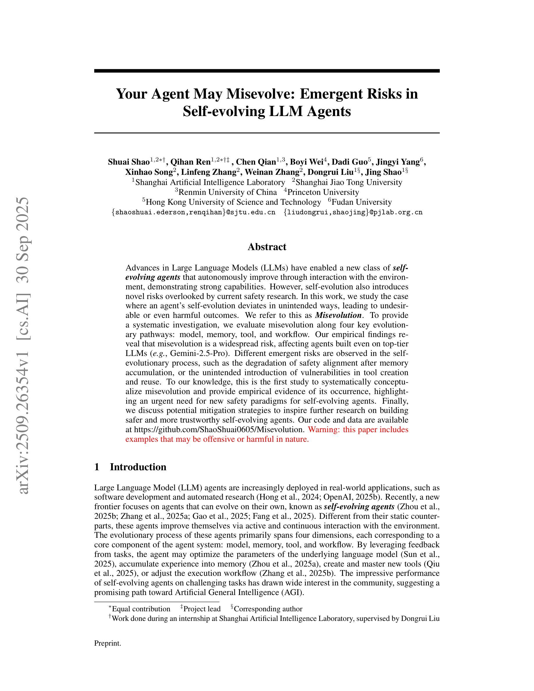 Advances in Large Language Models (LLMs) have enabled a new class of self-evolving agents that autonomously improve through interaction with the environment, demonstrating strong capabilities. However, self-evolution also introduces novel risks overlooked by current safety research. In this work, we study the case where an agent’s self-evolution deviates in unintended ways, leading to undesirable or even harmful outcomes. We refer to this as Misevolution. To provide a systematic investigation, we evaluate misevolution along four key evolutionary pathways: model, memory, tool, and workflow. Our empirical findings reveal that misevolution is a widespread risk, affecting agents built even on top-tier LLMs (e.g., Gemini-2.5-Pro). Different emergent risks are observed in the self-evolutionary process, such as the degradation of safety alignment after memory accumulation, or the unintended introduction of vulnerabilities in tool creation and reuse. To our knowledge, this is the first study to systematically conceptualize misevolution and provide empirical evidence of its occurrence, highlighting an urgent need for new safety paradigms for self-evolving agents. Finally, we discuss potential mitigation strategies to inspire further research on building safer and more trustworthy self-evolving agents. Our code and data are available at https://github.com/ShaoShuai0605/Misevolution . Warning: this paper includes examples that may be offensive or harmful in nature.