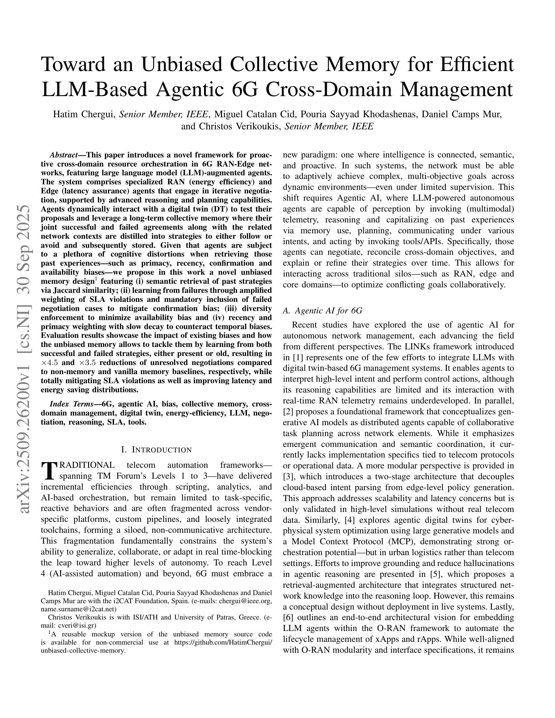 本文介绍了一种用于6G RAN-Edge网络中的主动跨域资源编排的新型框架。该系统包括专业化的RAN(能源效率)和边缘(延迟保证)代理,这些代理支持高级推理和规划能力,并参与迭代谈判。代理通过数字双胞胎进行测试其提议并动态交互,同时利用长期集体记忆存储成功和失败的协议以及相关网络上下文以制定策略。鉴于代理在检索过去的经验时会受到认知偏差的影响,本文提出了一种新型的无偏见记忆设计,包括语义检索过去策略、从失败中学习、多样性和执行权重的控制等策略。评估结果显示无偏见记忆有助于解决现有偏见问题,通过学习成功和失败的策略来减少未解决的谈判并提高网络性能。