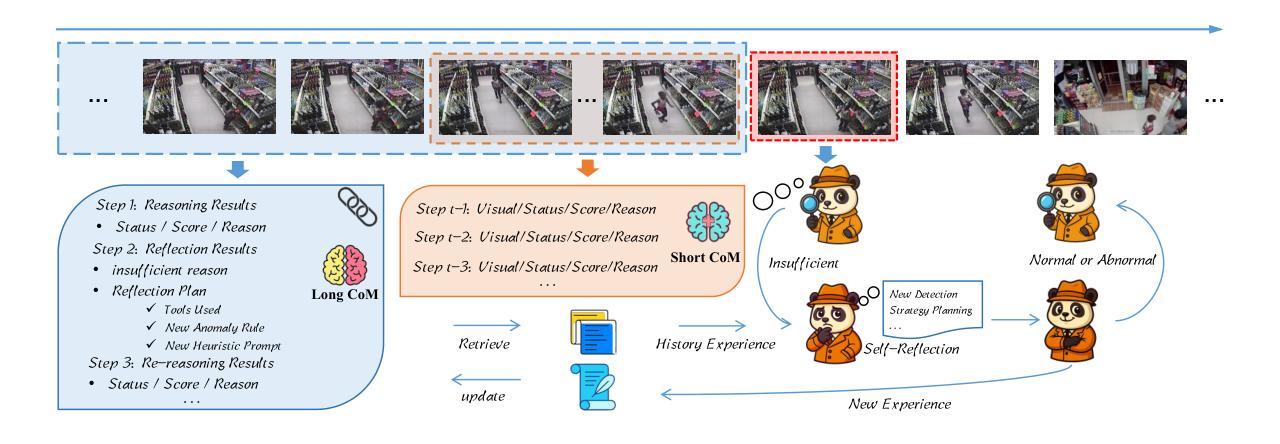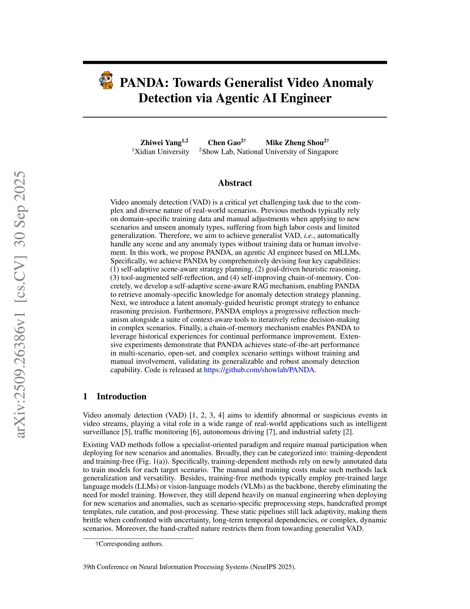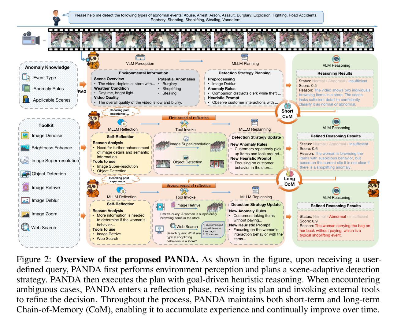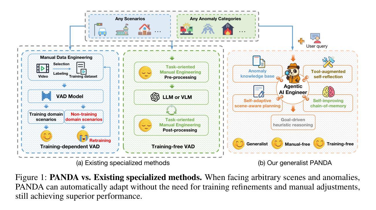 视频异常检测(VAD)是一项至关重要且具有挑战性的任务,因为现实世界的场景复杂多变。以前的方法通常依赖于特定领域的训练数据和在应用到新场景和未见异常类型时的手动调整,导致劳动成本高昂和有限的泛化能力。因此,我们的目标是实现通用VAD,即能够自动处理任何场景和任何异常类型,无需训练数据或人工参与。在这项工作中,我们提出了基于MLLMs的PANDA智能体AI工程师。具体来说,我们通过全面设计四个核心能力来实现PANDA:(1)自适应场景感知策略规划,(2)目标驱动启发式推理,(3)工具增强自我反思,以及(4)自我改进的记忆链。具体来说,我们开发了一种自适应场景感知的RAG机制,使PANDA能够为异常检测策略规划检索特定异常的知识。接下来,我们引入了一种潜在异常引导的启发式提示策略,以提高推理精度。此外,PANDA采用了一种渐进的反思机制和一系列上下文感知工具,以迭代优化复杂场景中的决策制定。最后,记忆链机制使PANDA能够利用历史经验不断改善性能。大量实验表明,PANDA在无训练和人工参与的多场景、开放集和复杂场景设置中实现了最先进的性能,验证了其泛化和鲁棒的异常检测能力。代码已发布在https://github.com/showlab/PANDA。