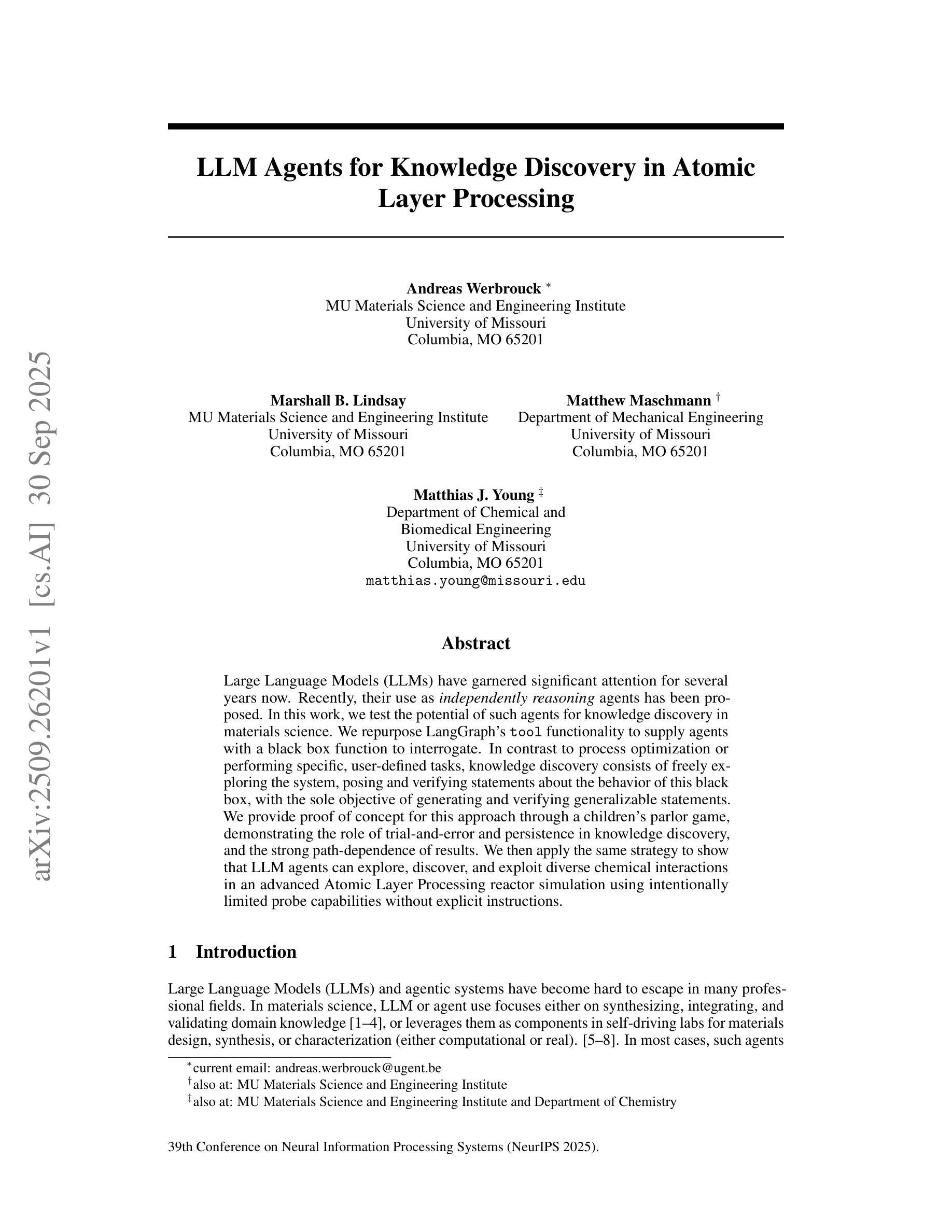 近年来,大型语言模型(LLMs)已经引起了人们多年的关注。最近,有人提出了将其用作独立推理代理。在这项工作中,我们测试了此类代理在材料科学中发现知识的潜力。我们重新利用LangGraph的工具功能,为代理提供一个黑箱函数进行询问。与流程优化或执行特定、用户定义的任务不同,知识发现包括自由探索系统,提出并验证有关黑箱行为的陈述,以生成和验证可推广的陈述为唯一目标。我们通过儿童游乐游戏证明了这种方法的概念,展示了在知识发现中尝试和错误的重要性、毅力的作用以及结果的强烈路径依赖性。然后,我们应用相同的策略来展示LLM代理能够在先进的原子层处理反应器模拟中探索、发现和利用各种化学相互作用,即使使用有意限制的探测能力且没有明确的指令。