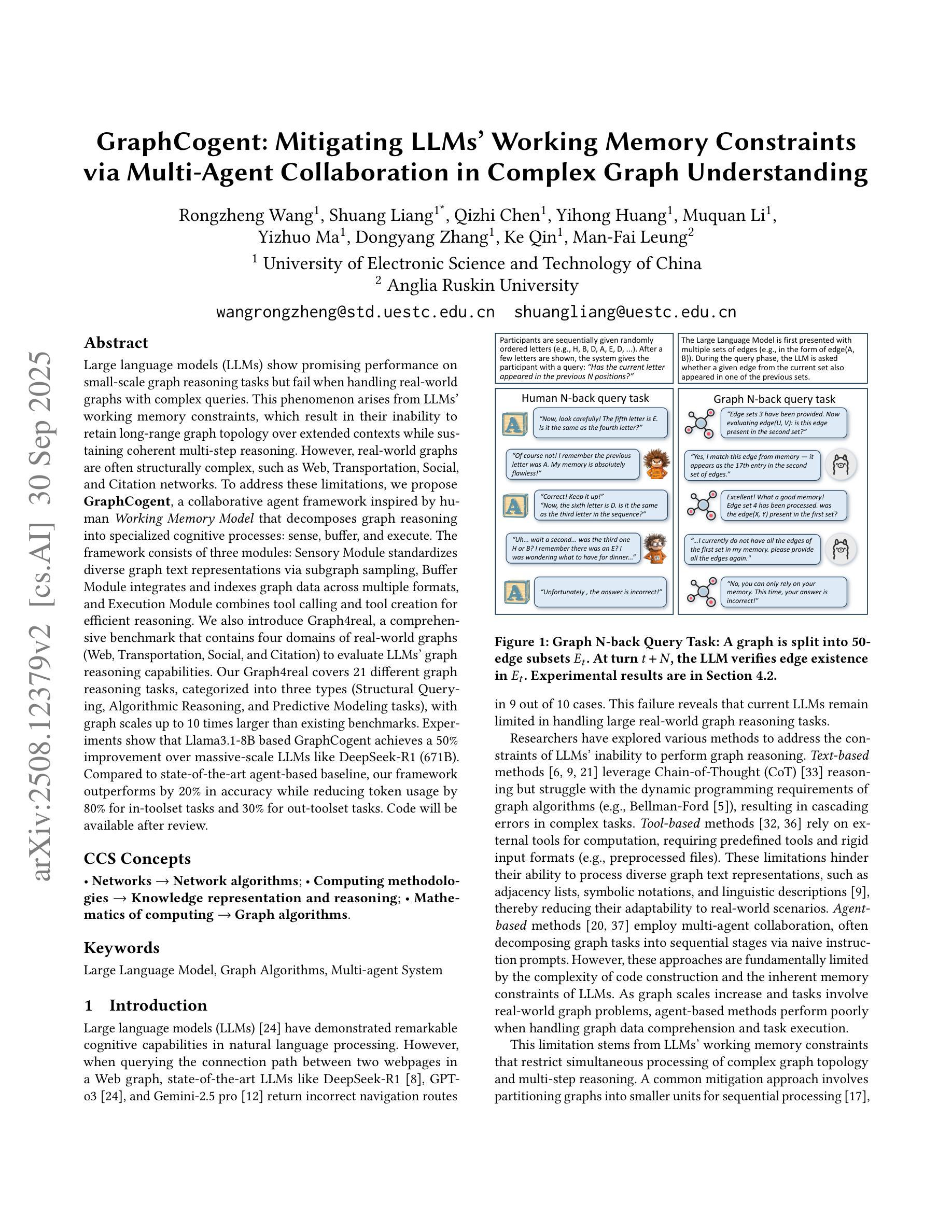 大型语言模型(LLMs)在小规模图推理任务上表现出有前景的性能,但在处理具有复杂查询的真实世界图时却失败了。这一现象源于LLMs的工作记忆约束,导致它们无法在长期上下文中保留长程图拓扑结构,同时维持连贯的多步推理。然而,真实世界的图通常是结构复杂的,如网页、交通、社交和引文网络。为了解决这些局限性,我们提出了GraphCogent,这是一个受人类工作记忆模型启发的协作代理框架,它将图推理分解成专门的认知过程:感知、缓冲和执行。该框架由三个模块组成:感官模块通过子图采样标准化各种图形文本表示,缓冲模块整合和索引跨多种格式的图数据,执行模块结合工具调用和工具创建进行高效推理。我们还引入了Graph4real,这是一个全面的基准测试,包含四个真实世界图的领域(网页、交通、社交和引文),以评估LLMs的图推理能力。我们的Graph4real涵盖了21种不同的图推理任务,分为三类(结构查询、算法推理和预测建模任务),图的规模高达现有基准测试的10倍。实验表明,基于Llama3.1-8B的GraphCogent在大型LLMs(如DeepSeek-R1 671B)上实现了50%的改进。与最先进的基于代理的基线相比,我们的框架在准确性上提高了20%,同时减少了工具内任务令牌使用量的80%和工具外任务令牌使用量的30%。代码将在审查后公布。