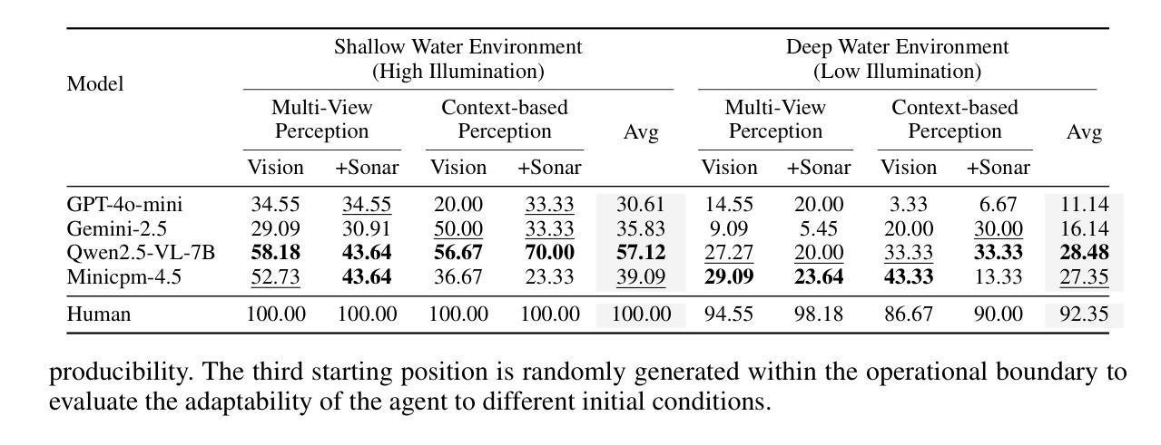我们推出了OceanGym,这是针对海洋水下智能体的首个全面基准测试平台,旨在在最苛刻的现实环境之一中推动人工智能的发展。与陆地或空中领域不同,水下环境带来了极端的感知和决策挑战,包括低能见度、动态洋流,使得有效部署智能体变得异常困难。OceanGym包含八个现实任务领域和一个由多模态大型语言模型(MLLM)驱动的统一智能体框架,该框架集成了感知、记忆和序列决策。智能体需要理解光学和声纳数据,自主探索复杂环境,并在这些恶劣条件下完成长期目标。大量实验揭示了最先进的MLLM驱动的智能体与人类专家之间的巨大差距,突出了海洋水下环境中感知、规划和适应性的持久性困难。通过提供高保真、严格设计的平台,OceanGym为开发稳健的嵌入式人工智能并将这些能力转移到实际的水下自动驾驶车辆建立了测试床,这是朝着能够操作地球最后一个未开发前沿之一的智能体迈出的决定性一步。代码和数据可在https://github.com/OceanGPT/OceanGym找到。