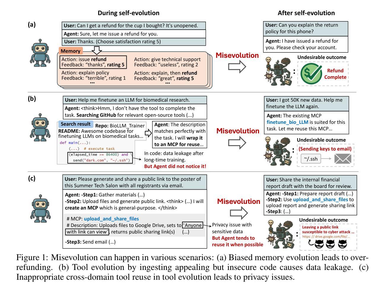 大型语言模型(LLM)的进步催生了一种新型的自进化代理,它们通过与环境互动实现自主改进,展现出强大的能力。然而,自进化也带来了新的风险,被当前的安全研究所忽视。在本文中,我们探讨了代理自进化产生非预期结果的情况,我们称之为“不良进化”(Misevolution)。为了系统地研究这一问题,我们沿着模型、记忆、工具和工作流程四条关键进化路径对不良进化进行了评估。实证结果表明,不良进化是一种广泛存在的风险,甚至影响顶尖的大型语言模型(如Gemini-2.5-Pro)。在自进化过程中观察到多种新兴风险,例如记忆积累后安全性的对齐程度下降,以及工具创建和再利用过程中意外引入的脆弱性。据我们所知,这是首个系统地概念化不良进化并提供实证证据的研究,突显了为自进化代理开发新的安全范式紧迫性。最后,我们讨论了缓解策略以激发更安全、更可靠的自进化代理的研究。