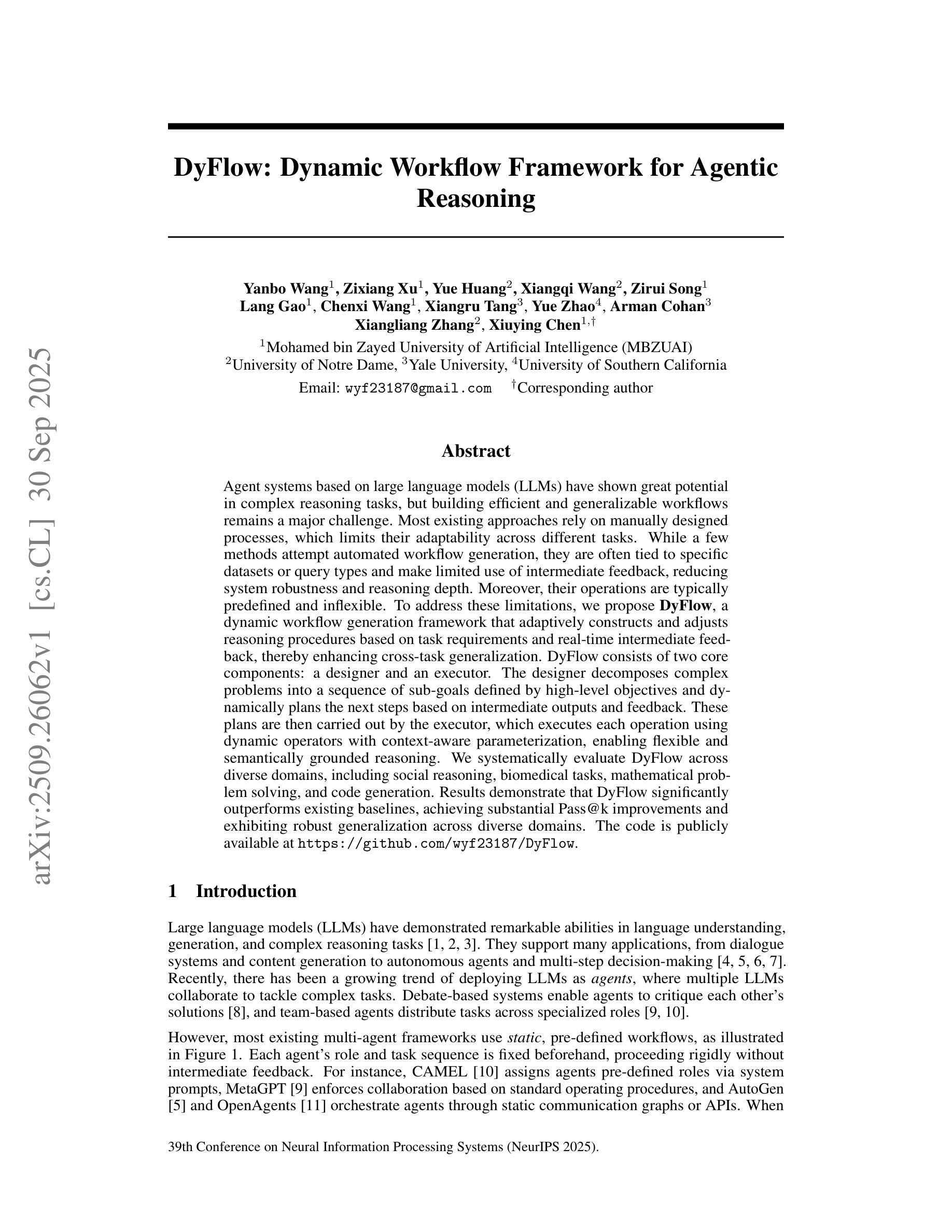 基于大型语言模型(LLM)的Agent系统在复杂推理任务中展现出巨大潜力,但构建高效且可推广的工作流程仍是主要挑战。现有方法大多依赖手动设计过程,限制了其在不同任务中的适应性。针对这一问题,本文提出DyFlow动态工作流程生成框架,根据任务需求和实时中间反馈自适应构建和调整推理流程,提高跨任务泛化能力。DyFlow包含设计师和执行官两个核心组件,设计师将复杂问题分解为一系列子目标,并根据中间输出和反馈动态规划下一步操作;执行官则负责执行每个操作,采用具有上下文感知的参数化动态操作符,实现灵活且语义丰富的推理。实验结果表明,DyFlow在社交推理、生物医学任务、数学问题求解和代码生成等多个领域均显著优于现有基线方法,实现了显著的Pass@k提升和稳健的跨域泛化能力。