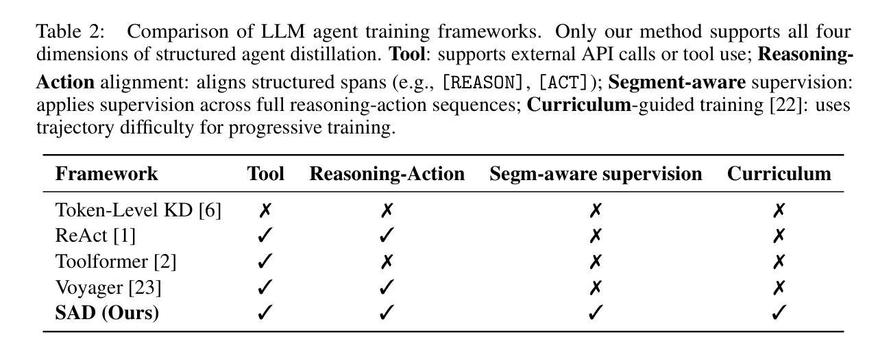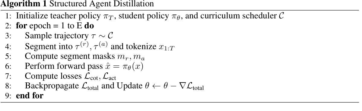 - 与标准的token级蒸馏不同,该方法通过分段轨迹进行推理和行动区间的特定损失应用,实现与教师行为的对齐。