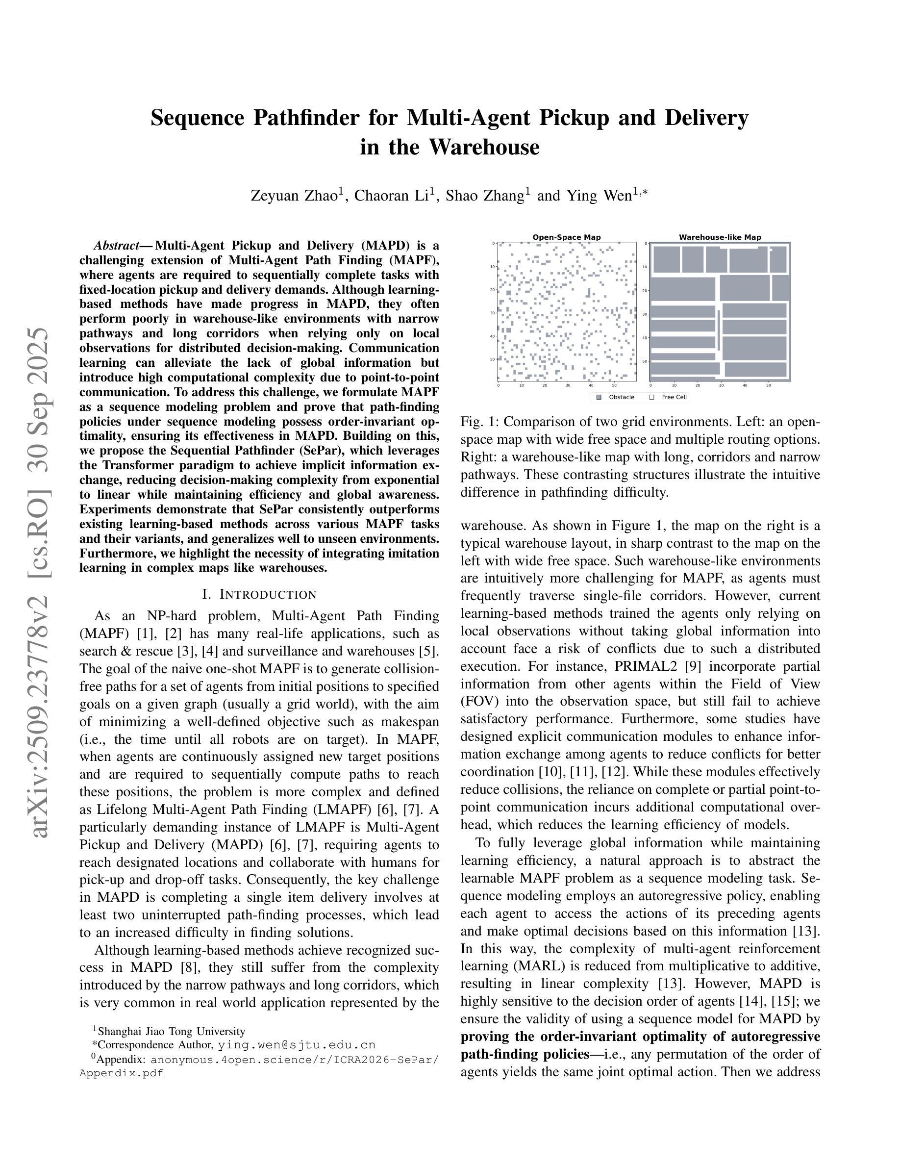 多智能体接送任务(MAPD)是多智能体路径查找(MAPF)的一个具有挑战性的扩展,其中要求智能体按顺序完成具有固定位置接送需求的任务。尽管基于学习的方法在MAPD中取得了进展,但在仓库等环境中,当仅依靠局部观察进行分布式决策时,它们在狭窄通道和长走廊中的表现往往不佳。通信学习可以缓解缺乏全局信息的问题,但由于点对点通信而引入了较高的计算复杂度。为了应对这一挑战,我们将MAPF制定为序列建模问题,并证明序列建模下的路径查找策略具有顺序不变的最优性,确保其适用于MAPD。在此基础上,我们提出了Sequential Pathfinder(SePar),它利用Transformer范式实现隐式信息交换,将决策复杂性从指数级降低到线性,同时保持效率和全局意识。实验表明,在各种MAPF任务及其变种中,SePar始终优于现有的基于学习的方法,并且能很好地推广到未见过的环境。此外,我们强调了在像仓库这样的复杂地图中集成模仿学习的必要性。